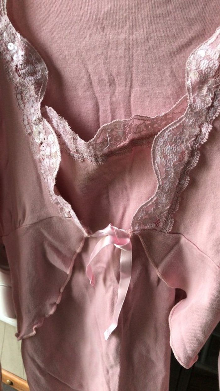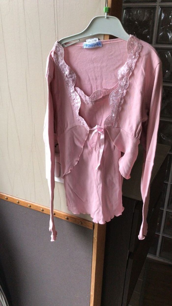 Petit haut couleur vieux rose avec bords en dentelle et sequins brillants Découpe en trompe l’œil pour un effet tee-shirt et boléro État neuf jamais porté