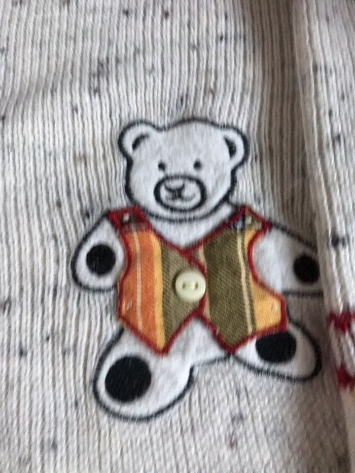 veste en laine synthétique à capuche fermée par boutons gris chiné à motifs oursons jaunes et cœurs rouges CLR