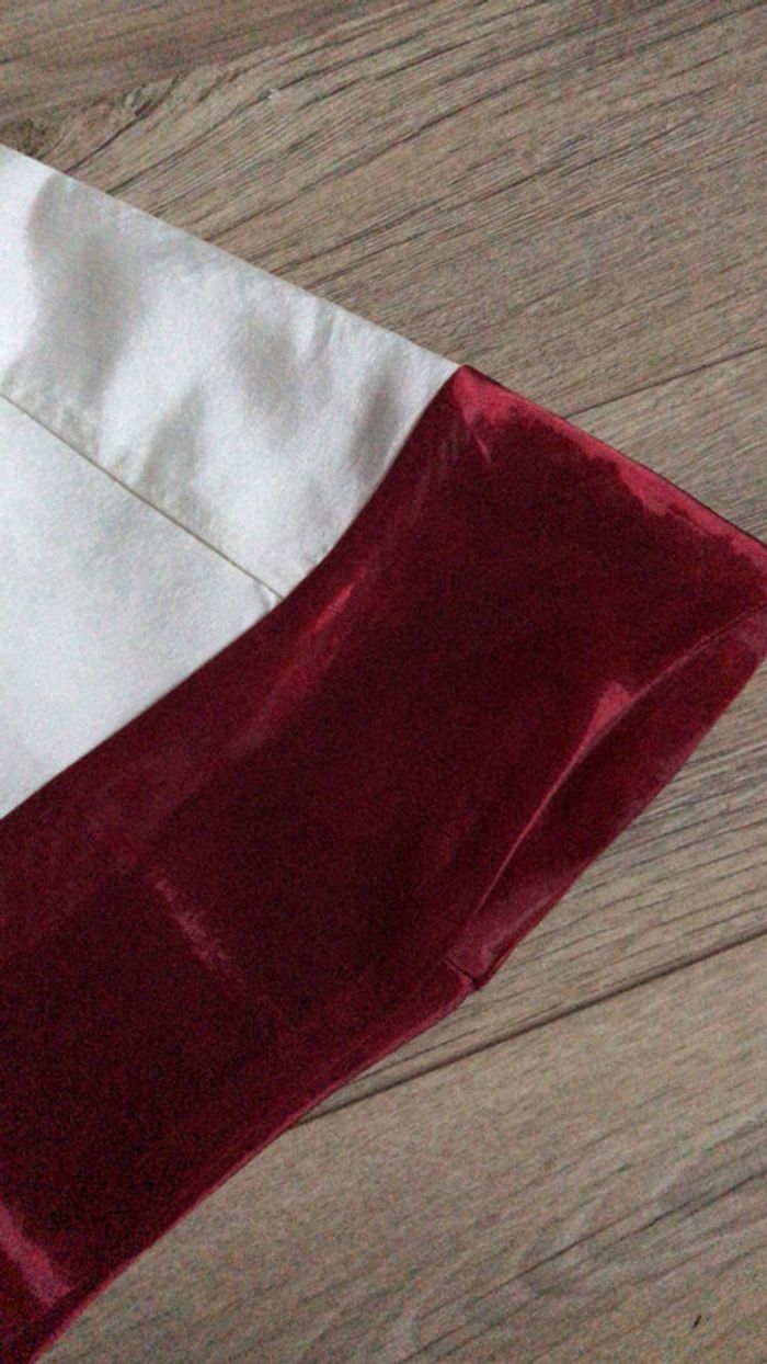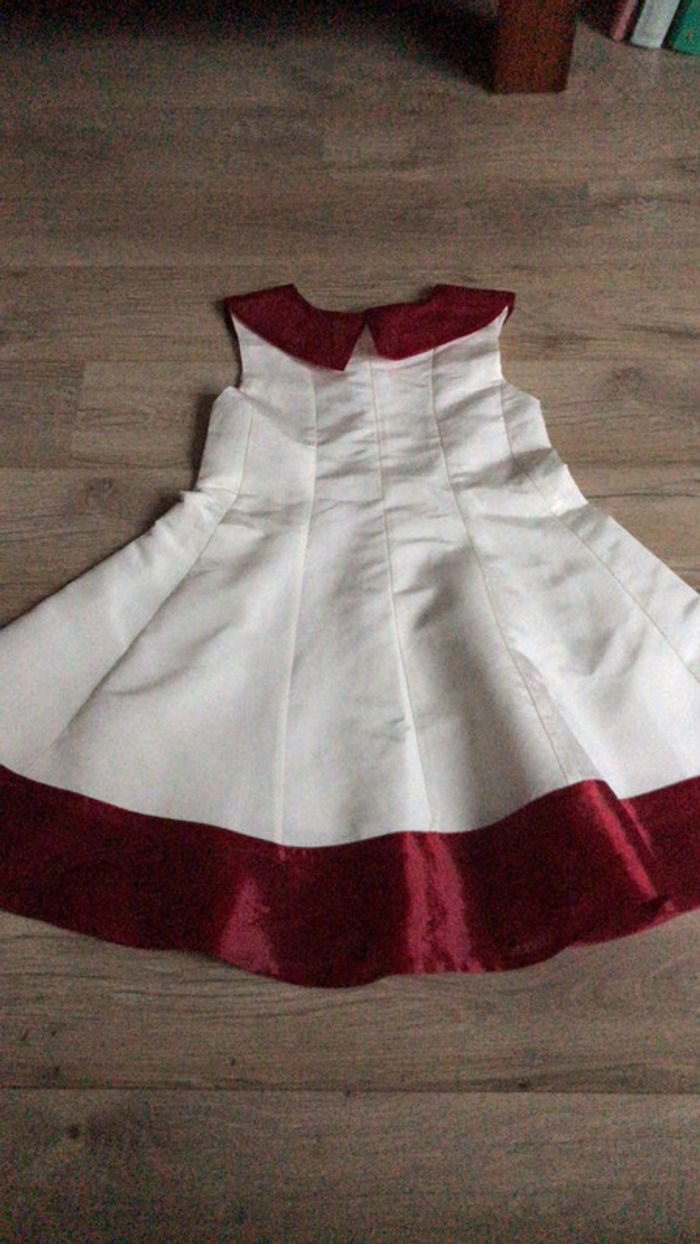Robe de cérémonie en satin beige et bordeaux. Col en superposition, s’ajuste dans le dos comme un ‘’corset”