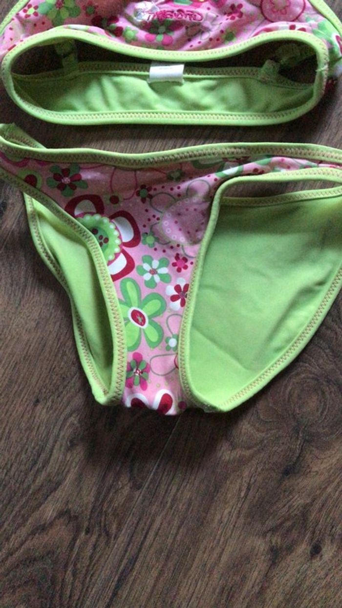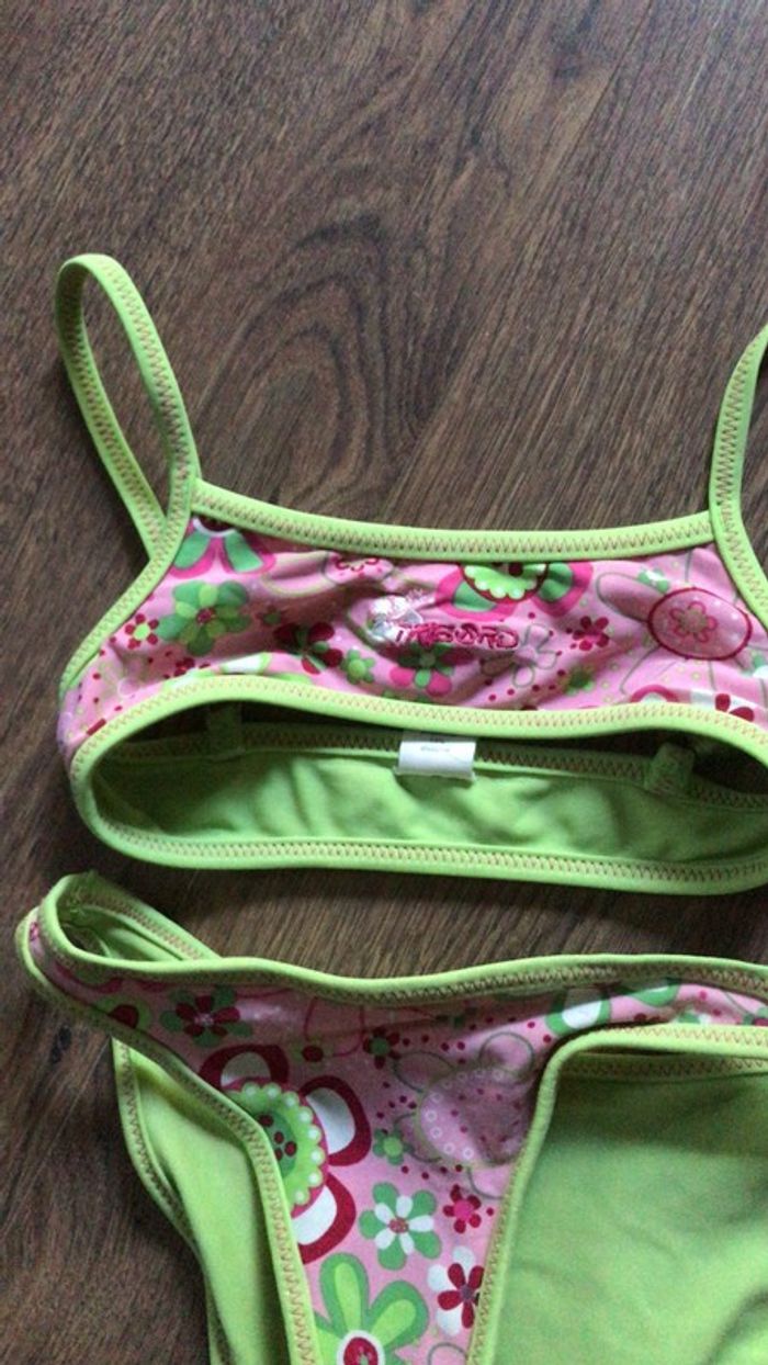Maillot de bain 2 pièces vert à motifs fleurs roses / verts taille indiquée 5 ans mais taille petit Je peux aussi envoyer par la poste pour réduire les frais envoi me demander