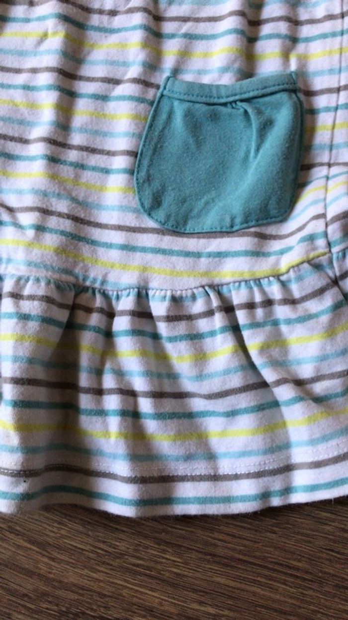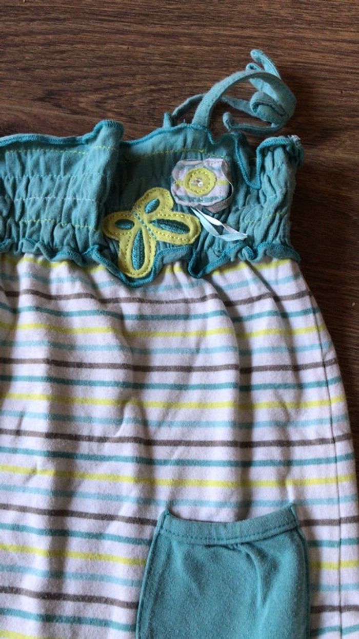 Robe été Orchestra à bretelles Fond blanc à rayures turquoises, anis et grises 2 poches sur le devant Un volant dans le bas