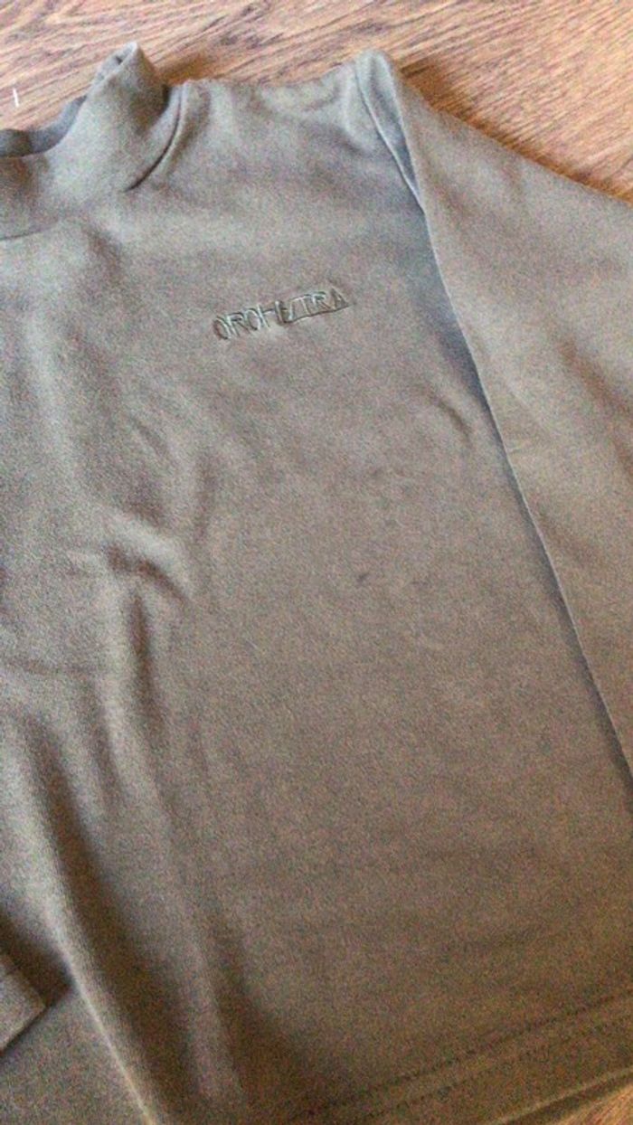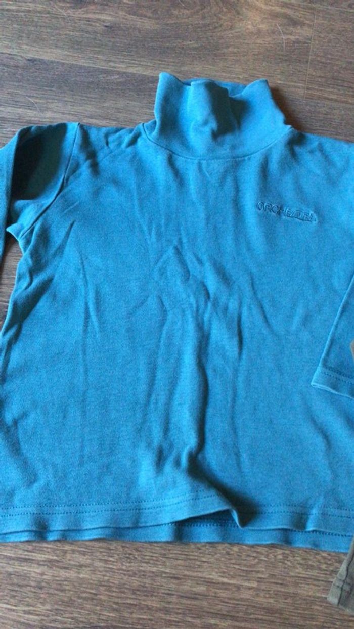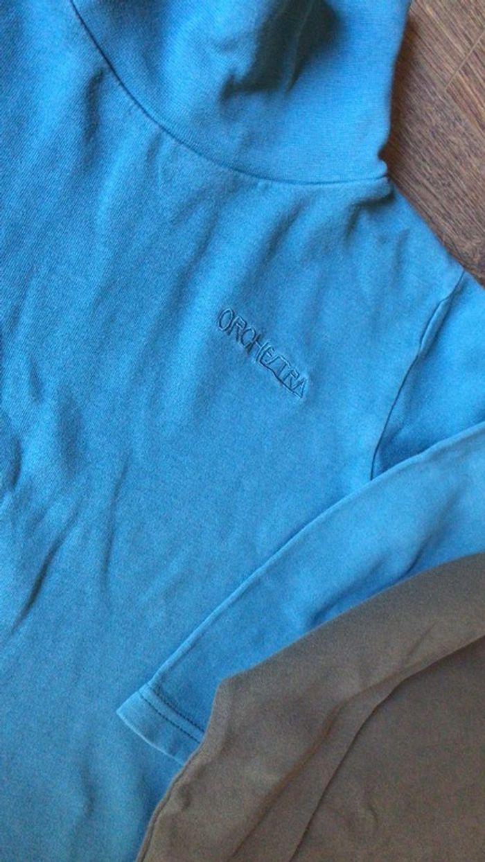 Lot 2 tee-shirts Orchestra à manches longues : - 1 bleu turquoise foncé à col montant - 1 kaki à col rond (toute petite tâche discrète sur celui-ci devant voir photo) Ils sont en bon état sans défaut excepté la micro tâche mentionnée