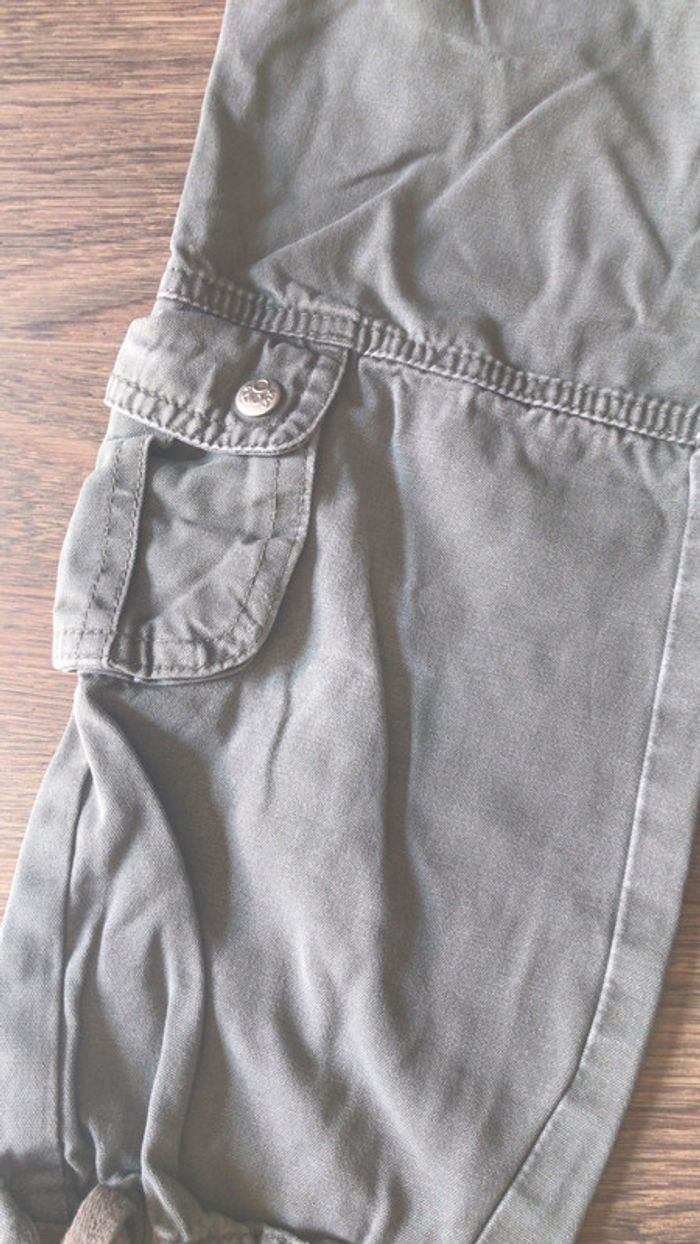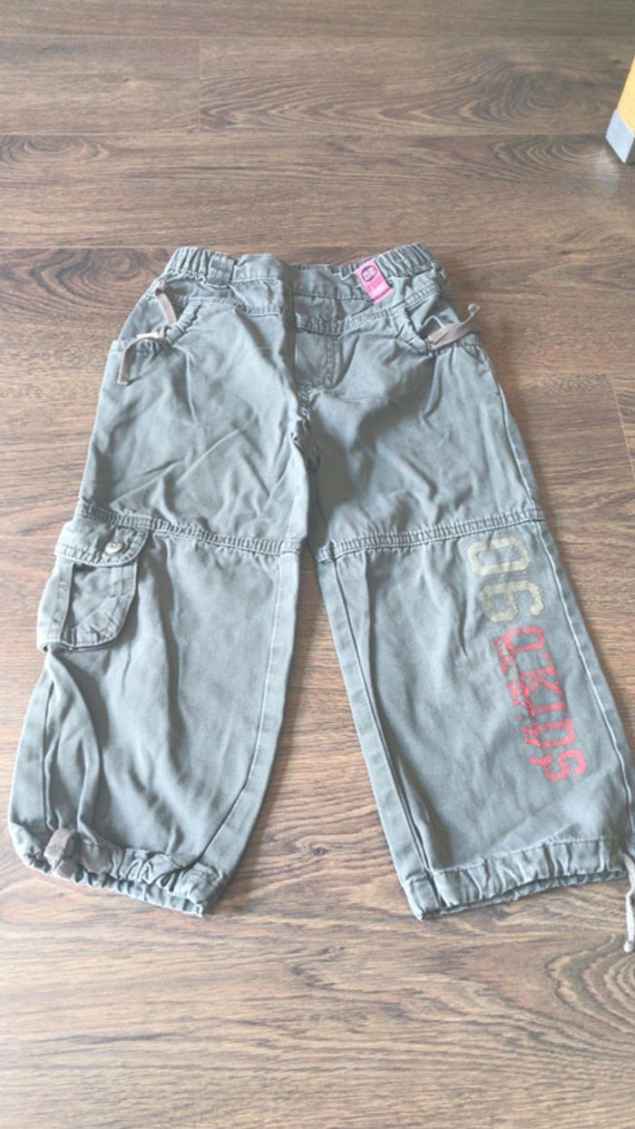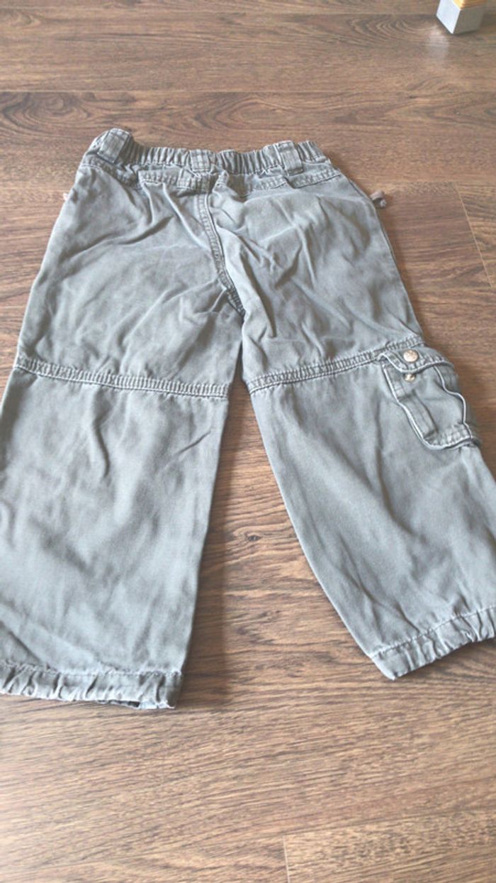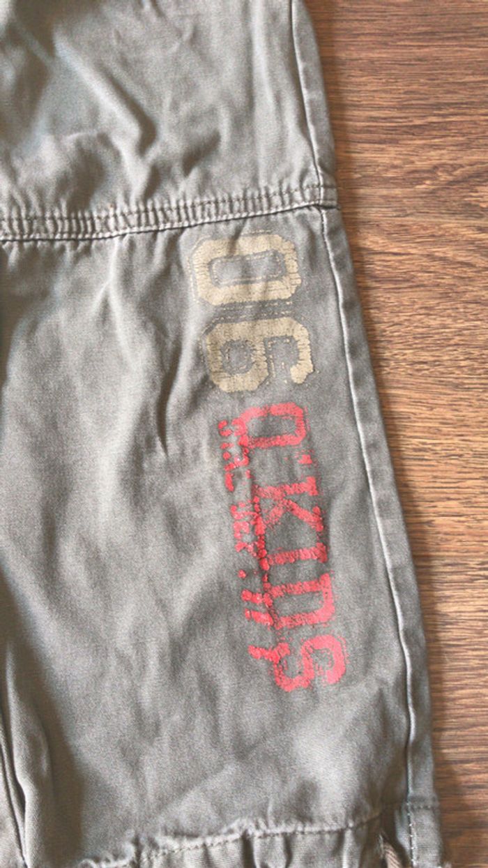Pantalon en toile kaki O’kids 2 poches sur le devant et inscription sur le bas de la jambe Un peu élimé sur le bas de l’ourlet de pantalon (je le donne si vous commandez 2 autres articles avec)