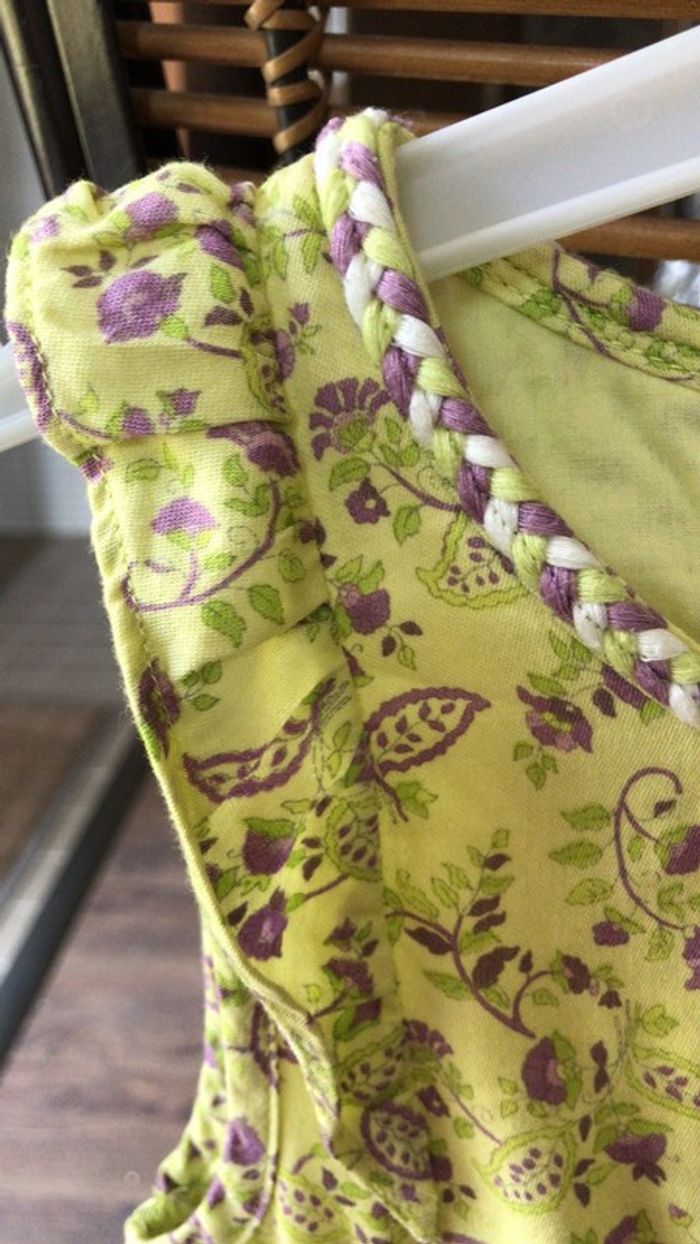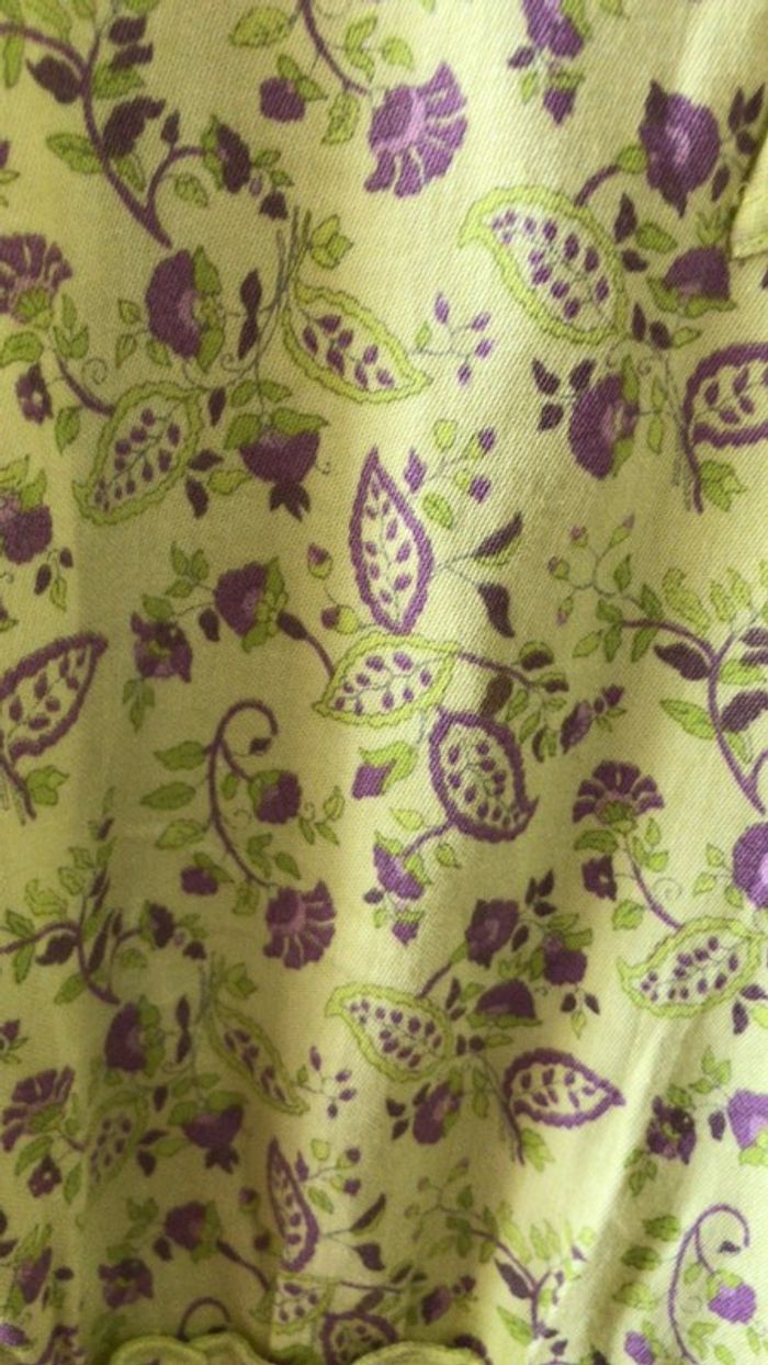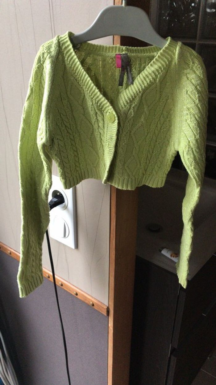 Ensemble Robe sans manche vert anis motifs mauves - ceinture en smoke, jupe à volants et son boléro Orchestra vert anis en laine fils brillants à motifs torsades Quasi État neuf Très joli pour une cérémonie CLR Un legging offert de la même collection