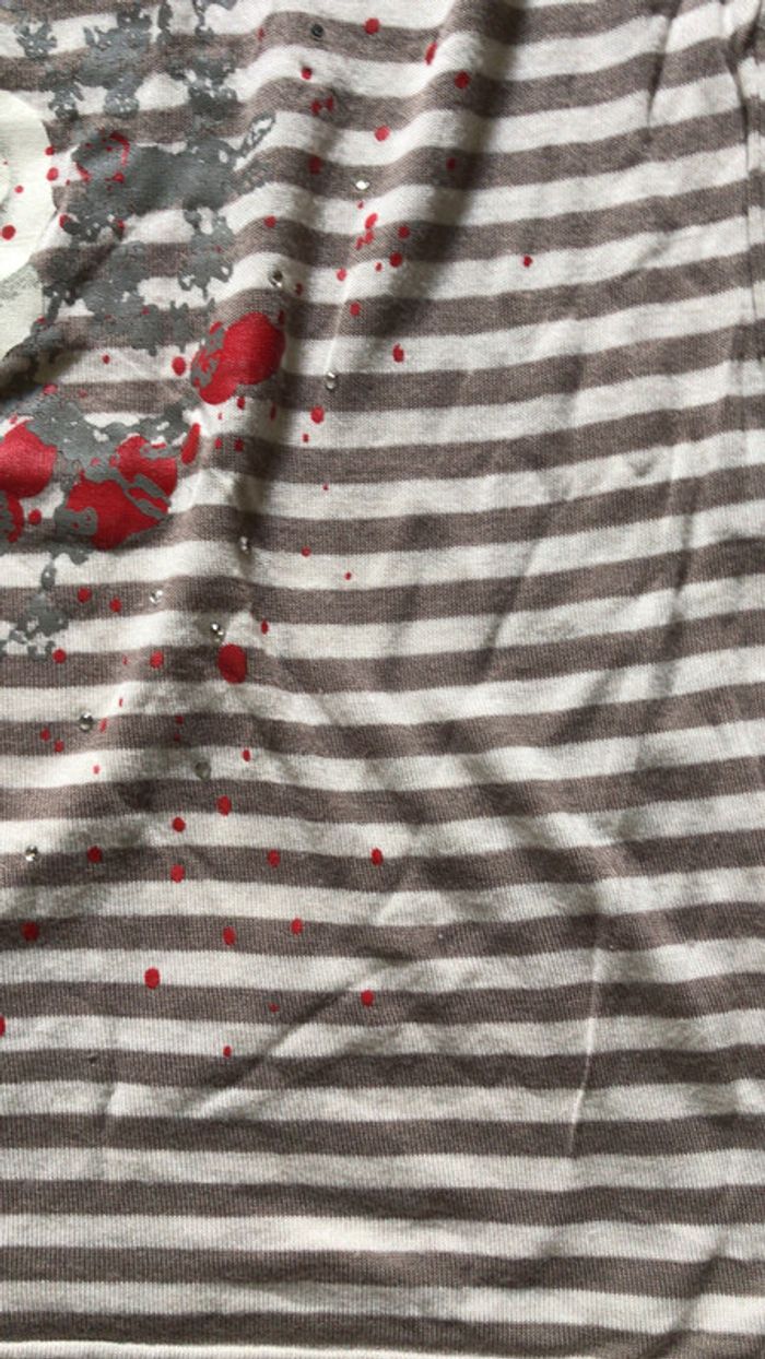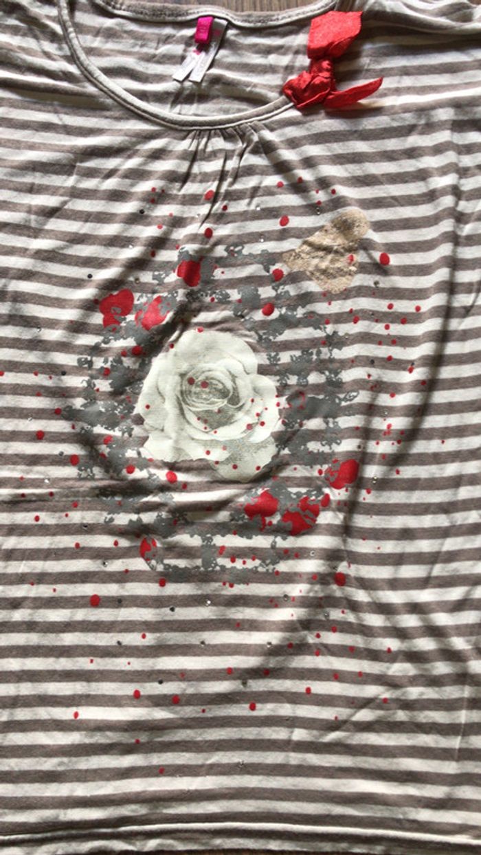 Tee-shirt Orchestra à rayures beiges et taupe motif rose sur le devant