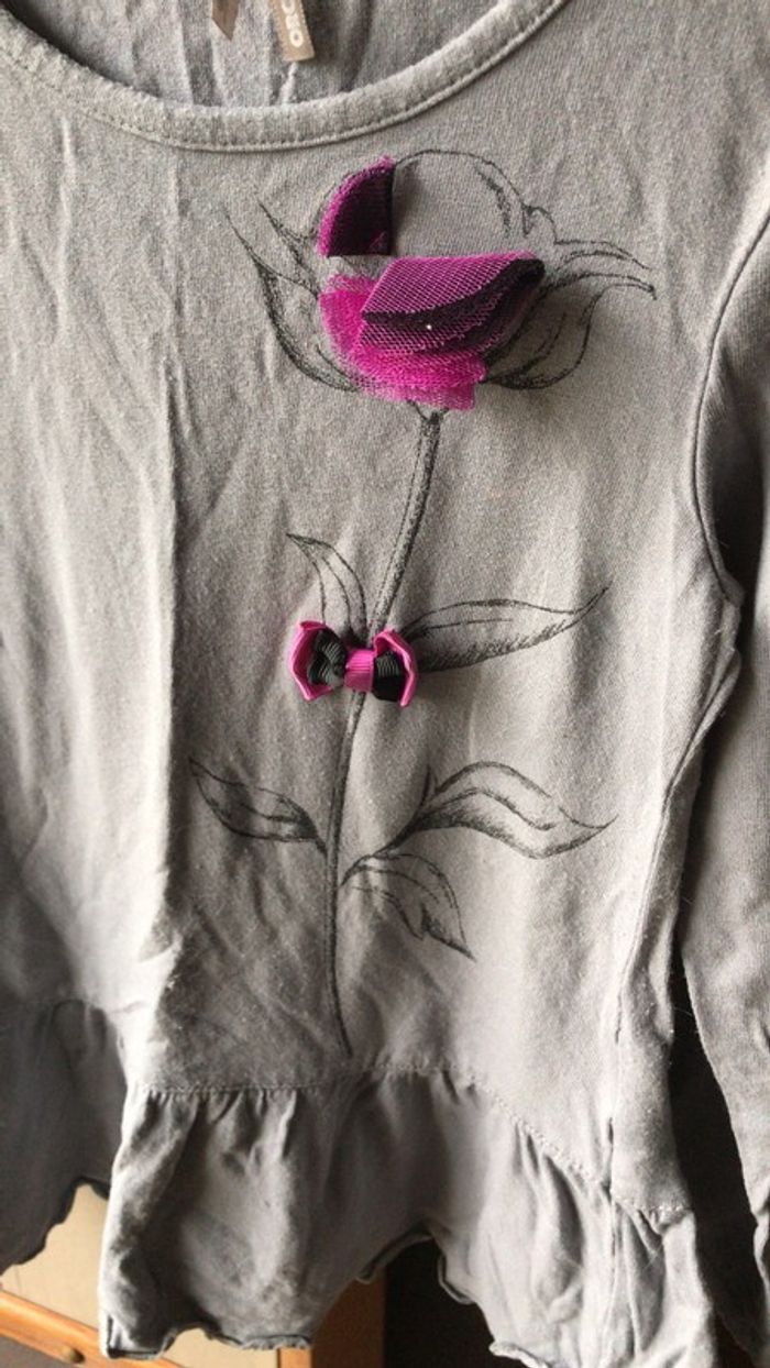 Tee-shirt gris à manches longues Orchestra 6 ans Motifs fleurs gris et fleurs cousues fushia et noires en relief