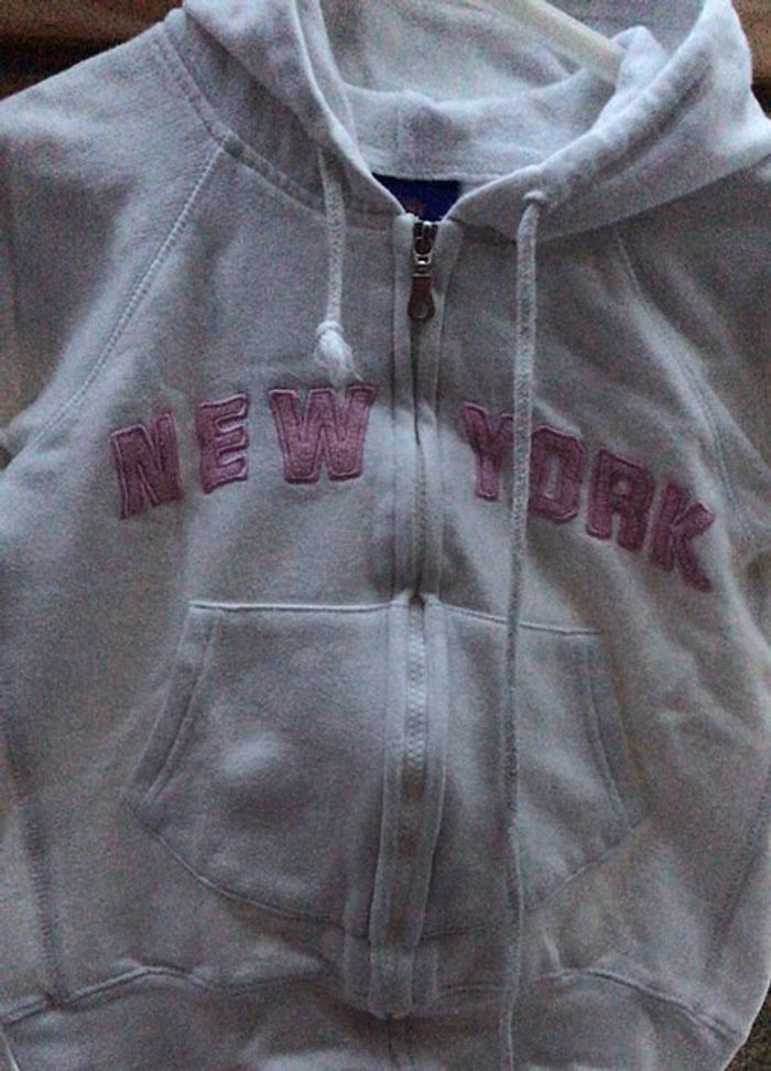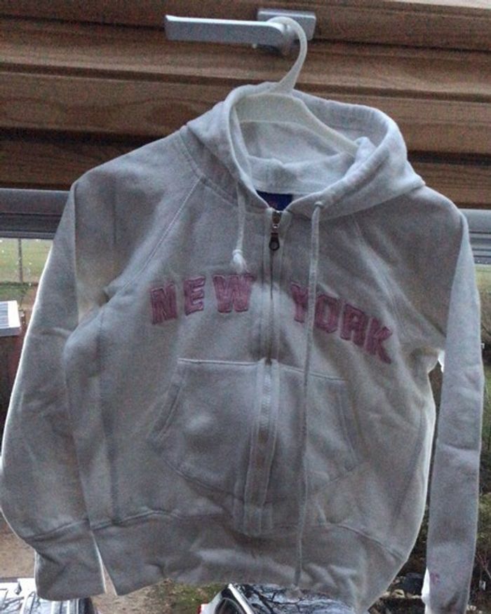 veste blanche en molleton avec inscription New-york rose sur le devant fermée par zip avec 2 poches kangourou