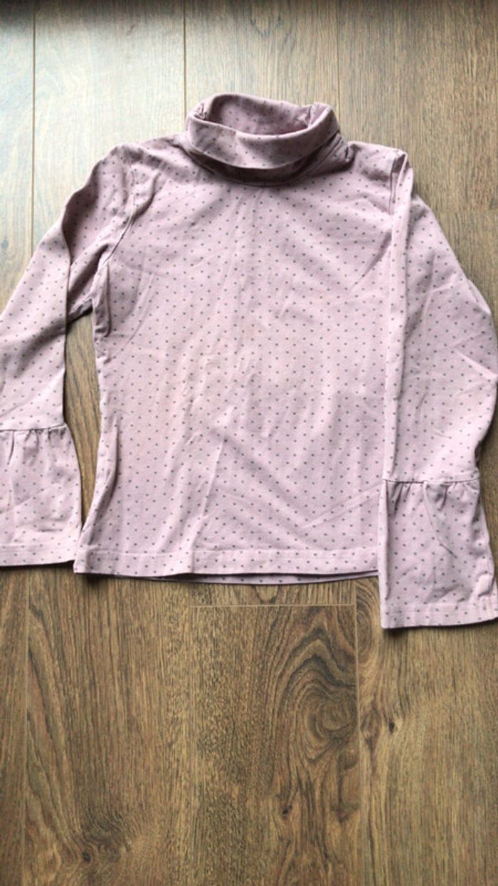 Tee-shirt à manches longues couleur vieux rose à petites étoiles grises col légèrement montant, bas des manches fantaisie