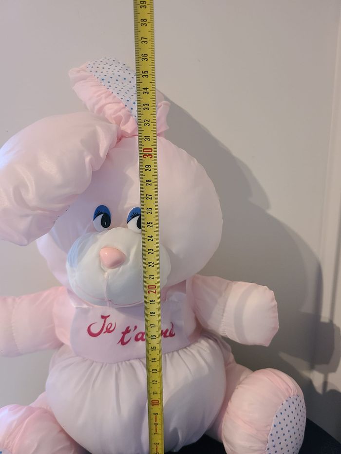 peluche lapin en toile je t'aime rose pale oreilles a pois vintage bikin style puffalump 48