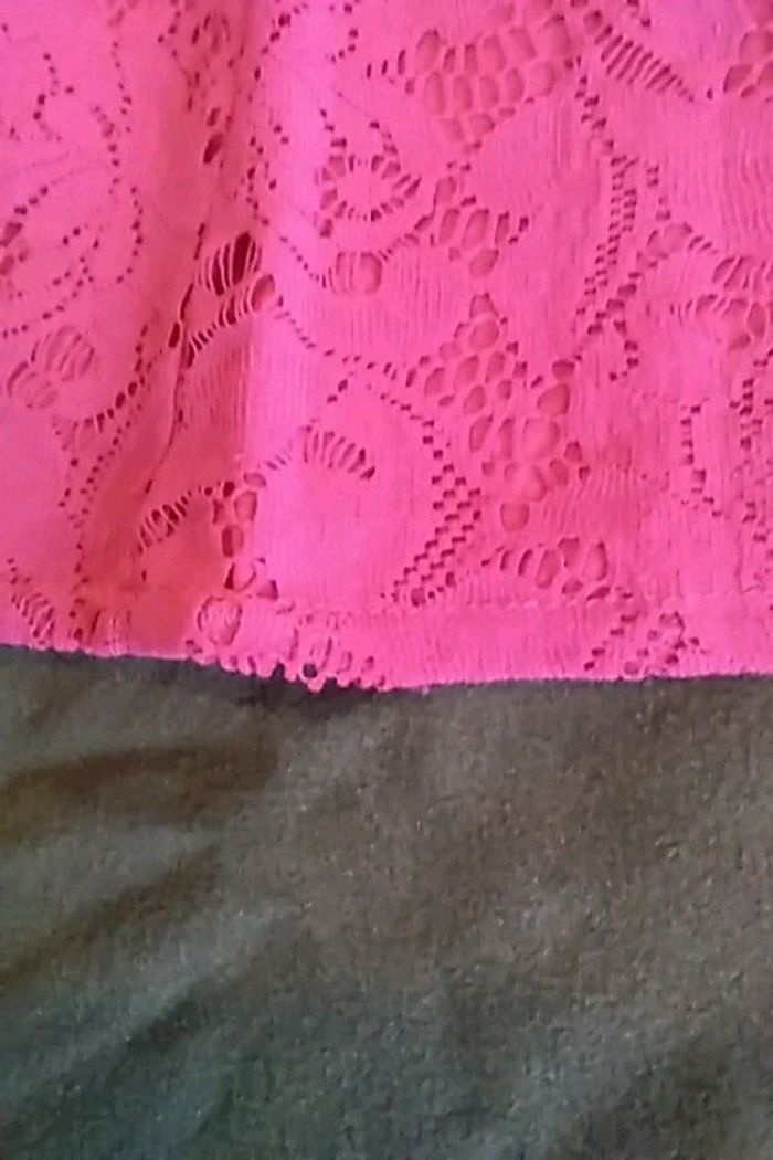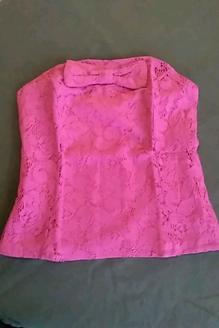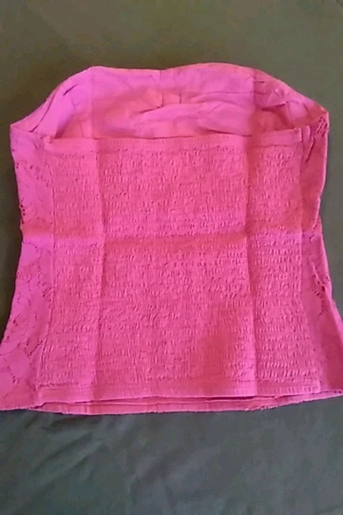 Bustier rose fushia, porté 3 fois, taille petit Marqué T40 mais correspond plus à un T38 selon moi Défaut : un fil qui a frotté près du noeud du bustier et une impression d'étirement en bas du vêtement
