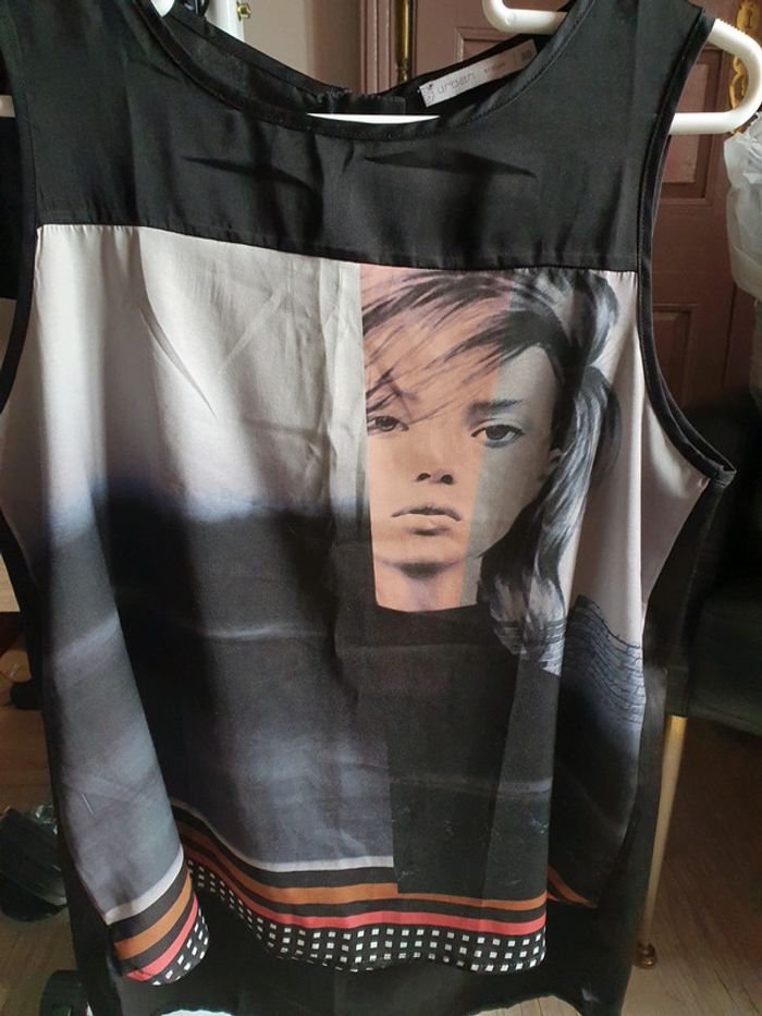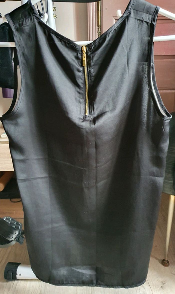 Jolie tunique à imprimé, effet satiné. Légère et agréable à porter. Taille 38. Fermeture zippée dans le dos