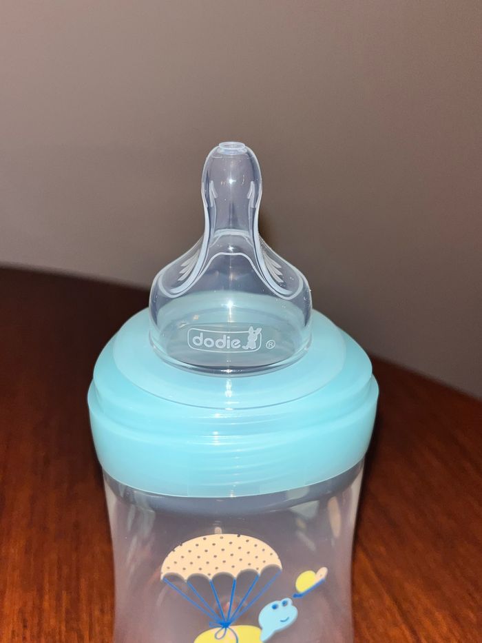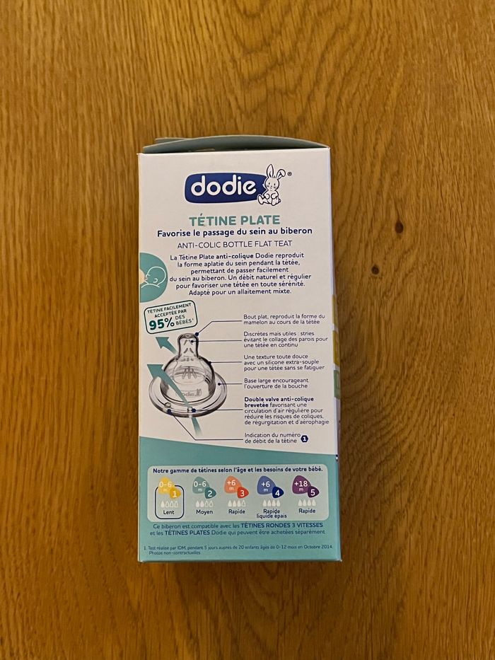 Biberon Dodie 0-6 mois anti colique neuf. Tétine plate, débit lent. Capacité de 150ml. Jamais utilisé.
