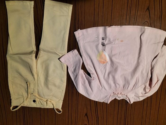 Ensemble jean avec bouton pression fonctionne parfaitement jaune clair et blouse rose avec dessin sur le devant en 24 mois marque sucre d'orge(Cf voir photos) #bouriquet79fille24mois