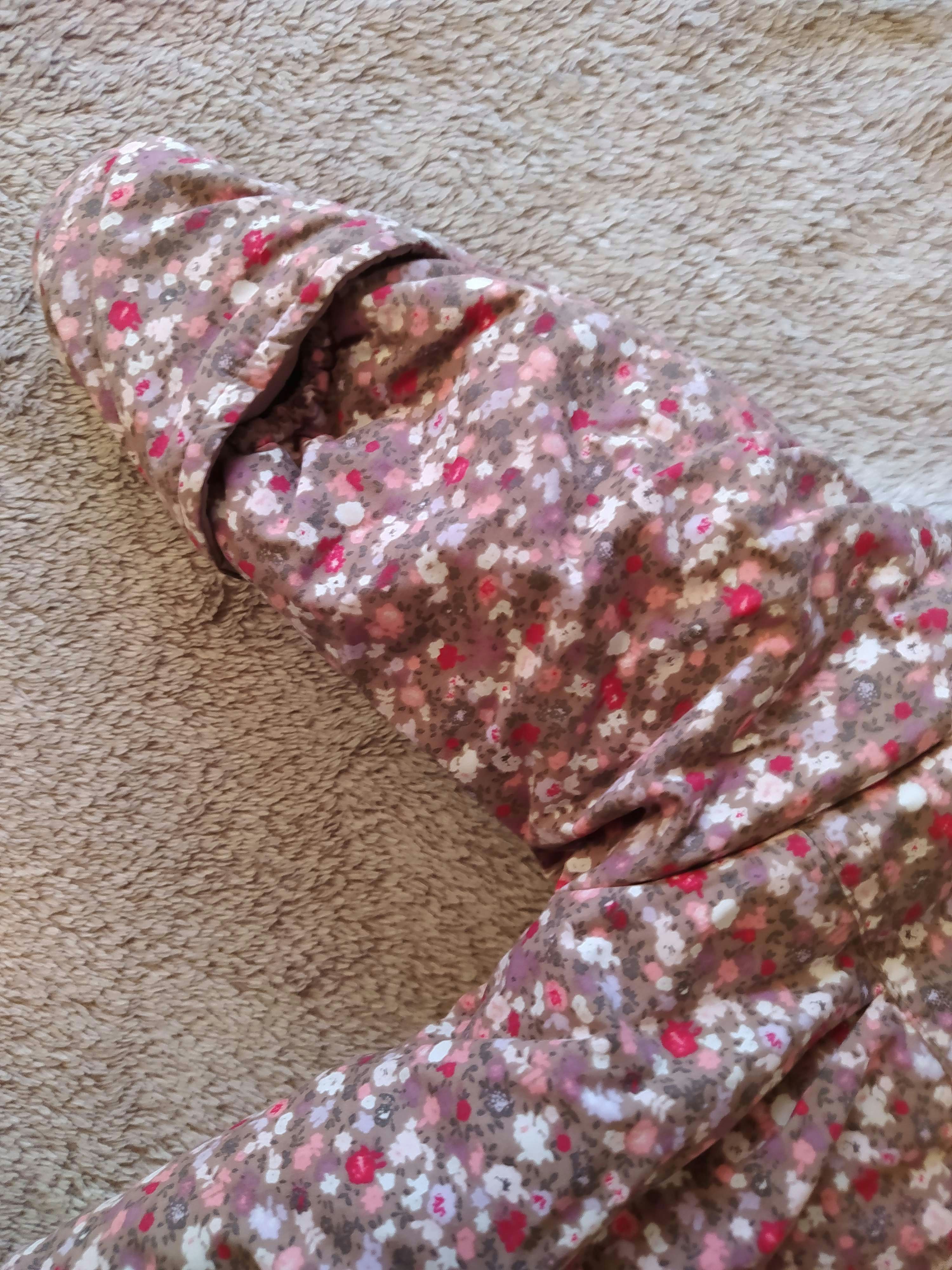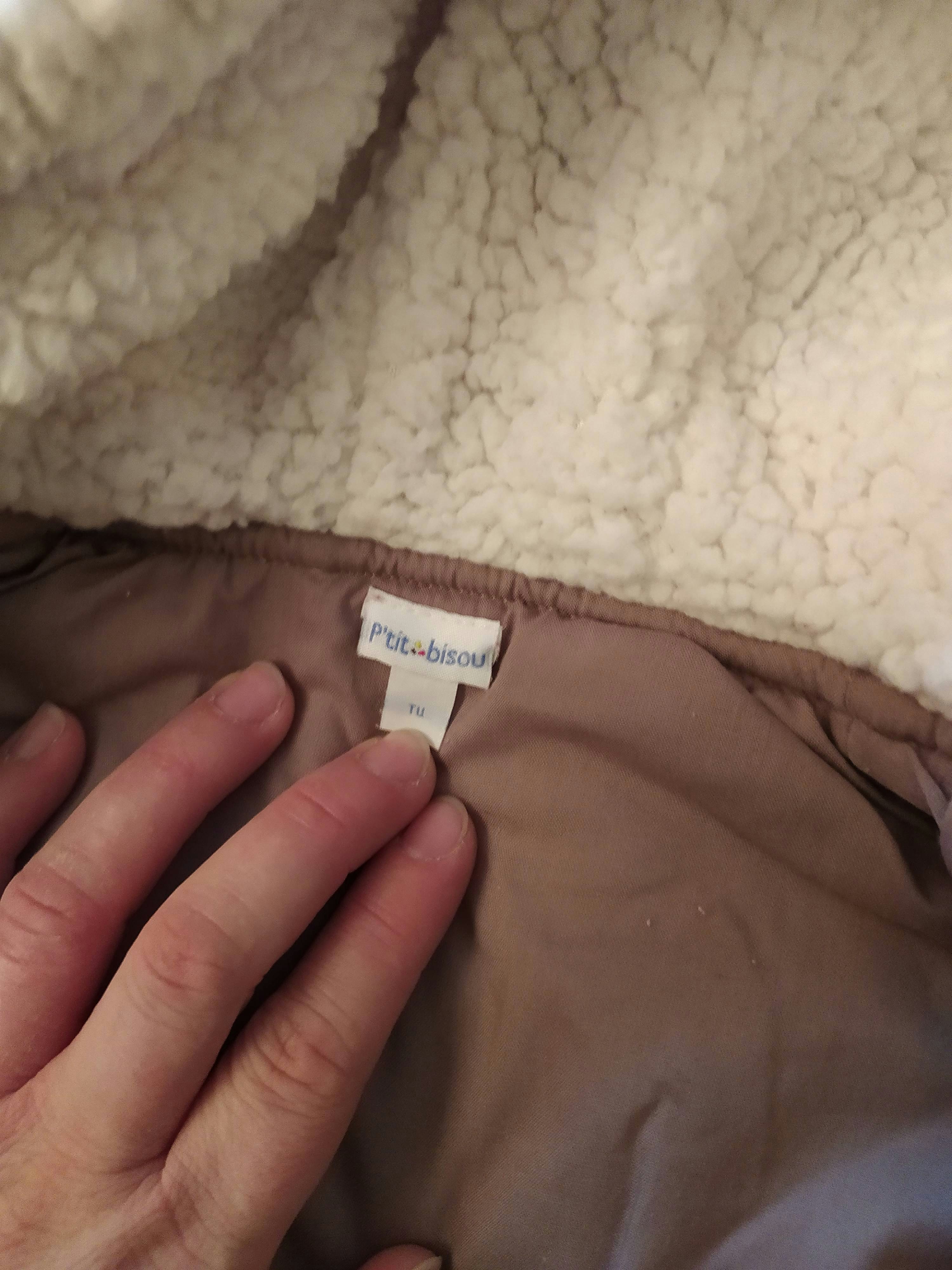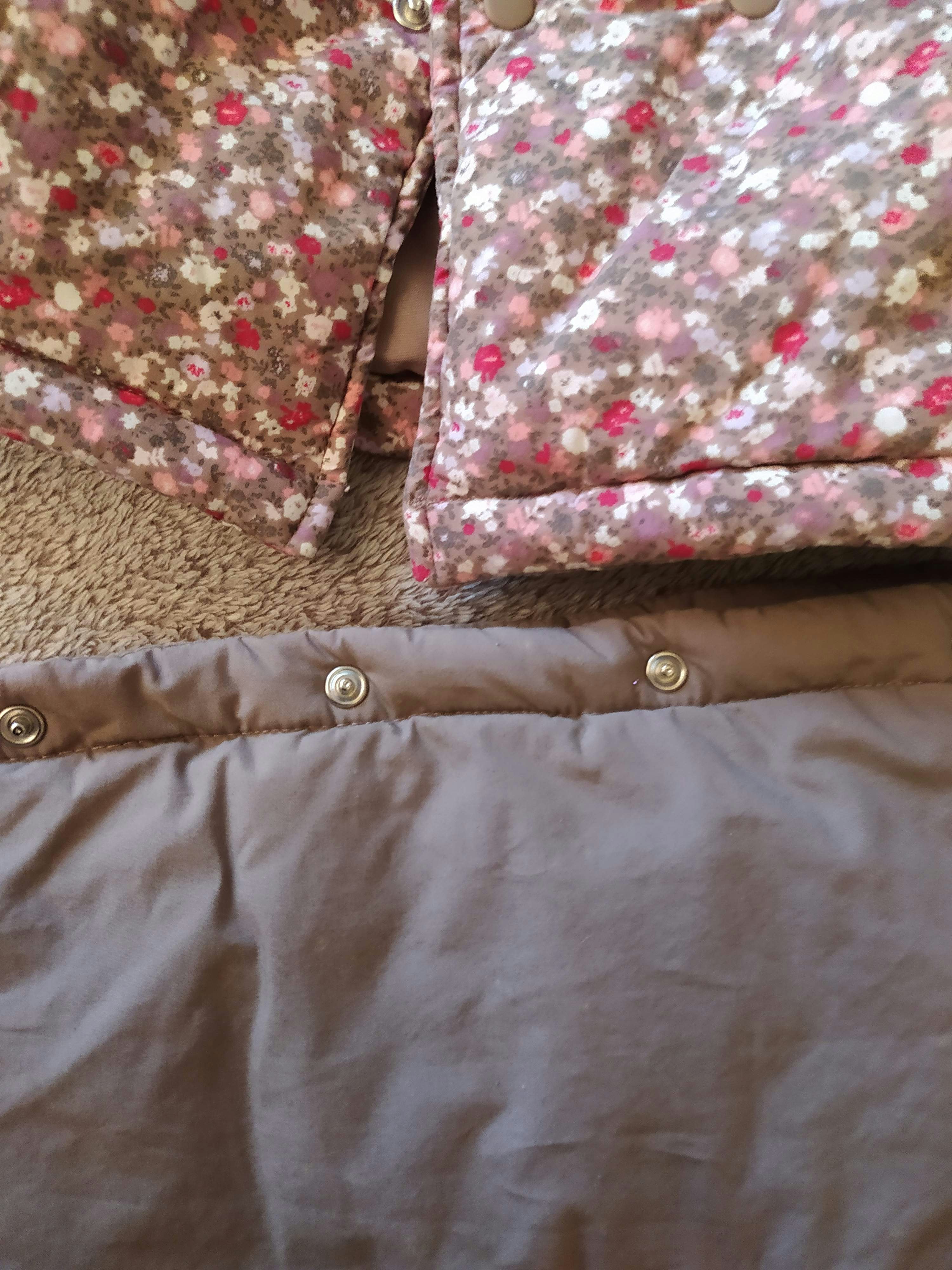 Achetée près de 50 € ! Marque P'tit bisou de chez Aubert. Superbe Combinaison 2 en 1 à la fois nid d'ange gigoteuse de transport avec passant ceinture et manteau ( la partie basse s'enlève par le biais de boutons-pression. Épaisse et chaude avec moufles intégrées. Partie basse couleur marron et partie haute motif floral liberty. Capuche avec intérieur chaud