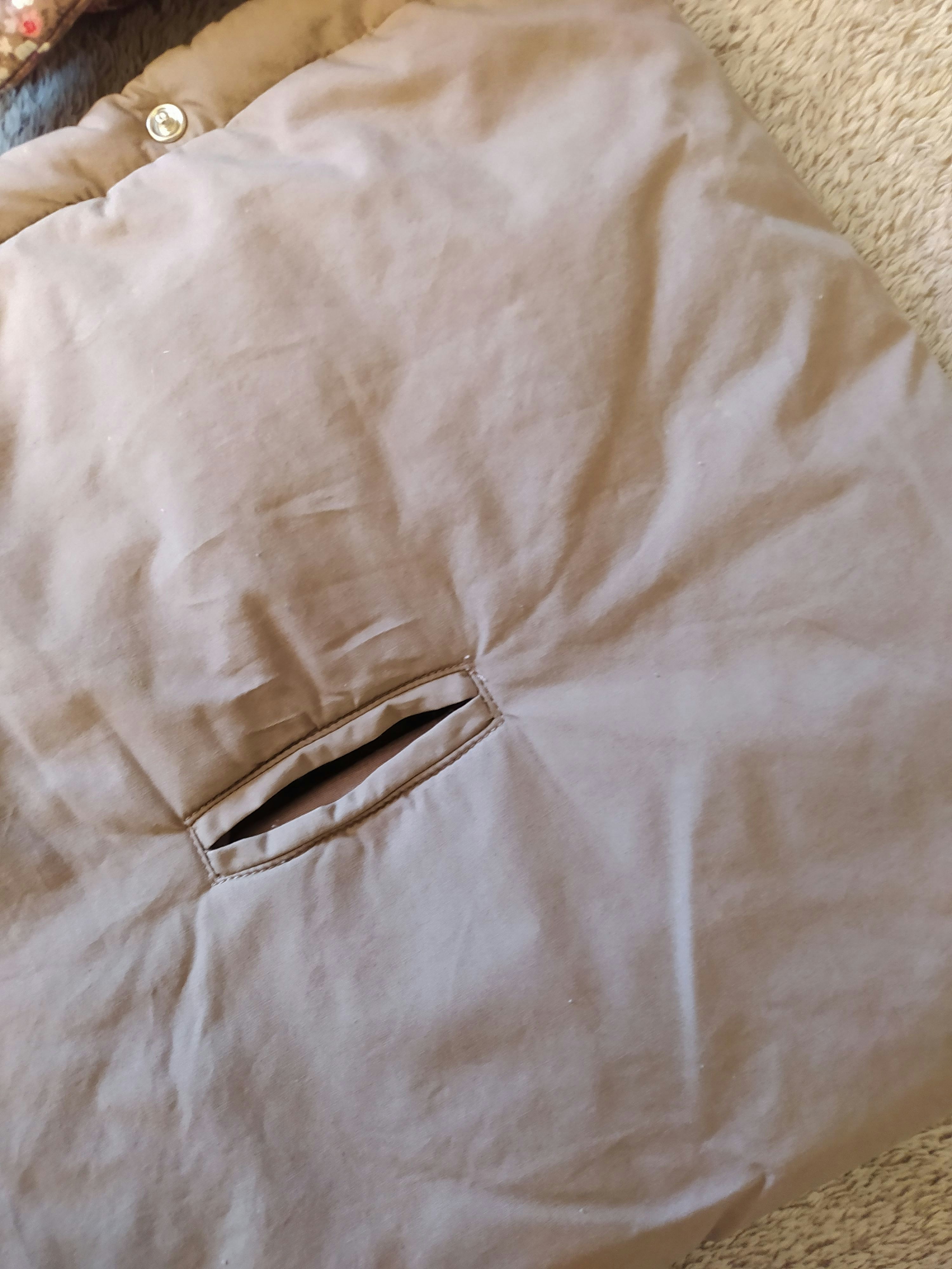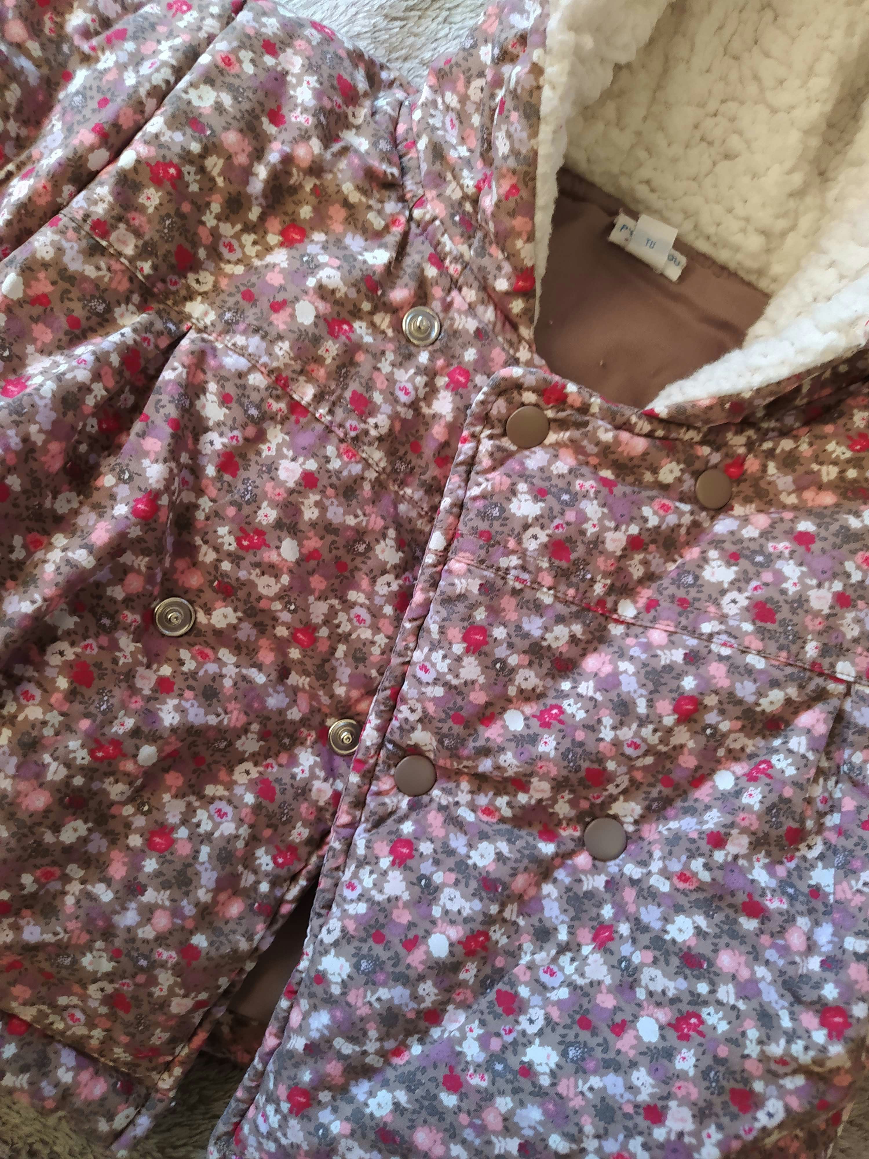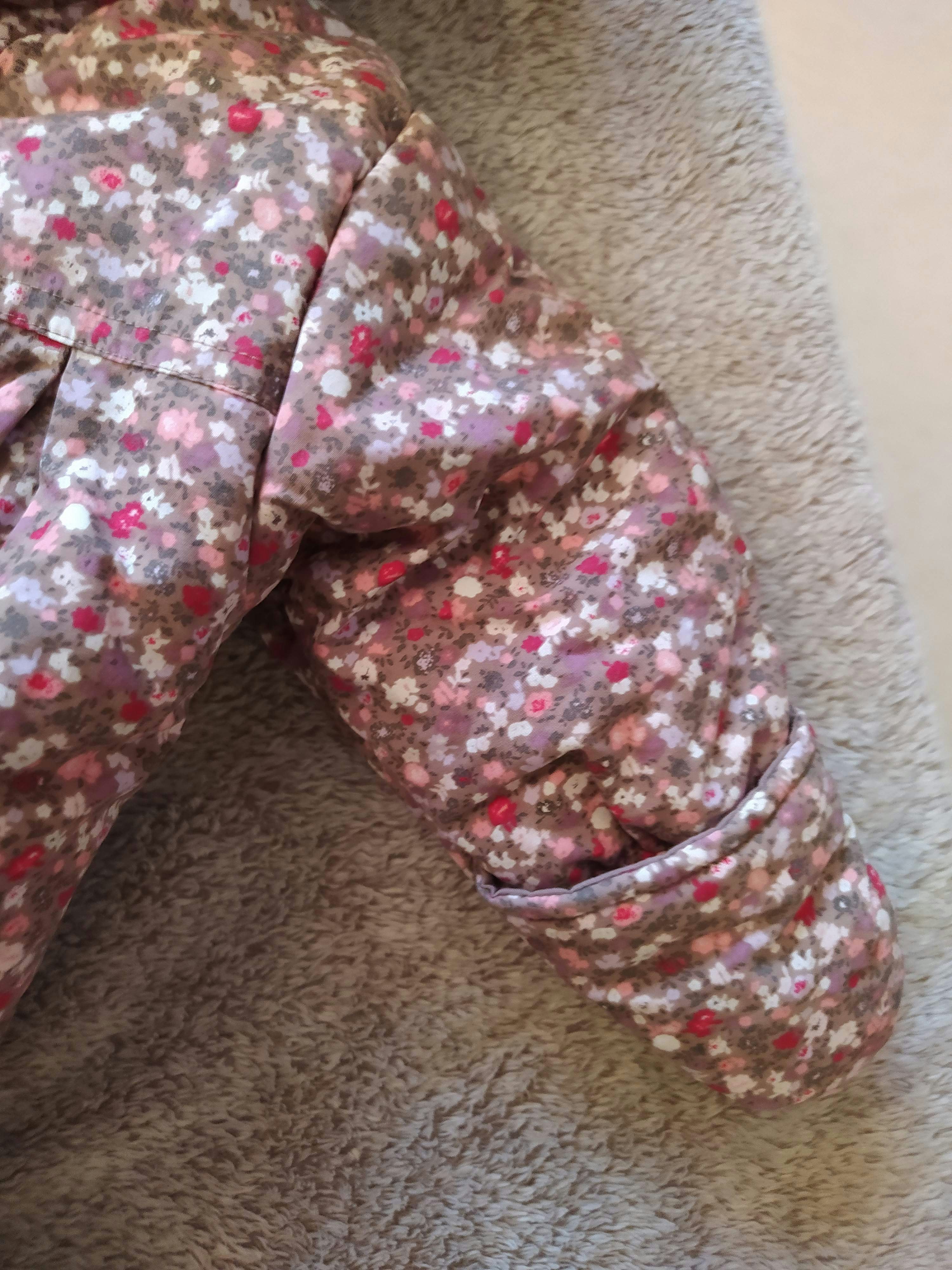 Achetée près de 50 € ! Marque P'tit bisou de chez Aubert. Superbe Combinaison 2 en 1 à la fois nid d'ange gigoteuse de transport avec passant ceinture et manteau ( la partie basse s'enlève par le biais de boutons-pression. Épaisse et chaude avec moufles intégrées. Partie basse couleur marron et partie haute motif floral liberty. Capuche avec intérieur chaud
