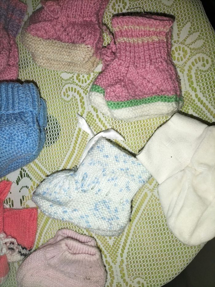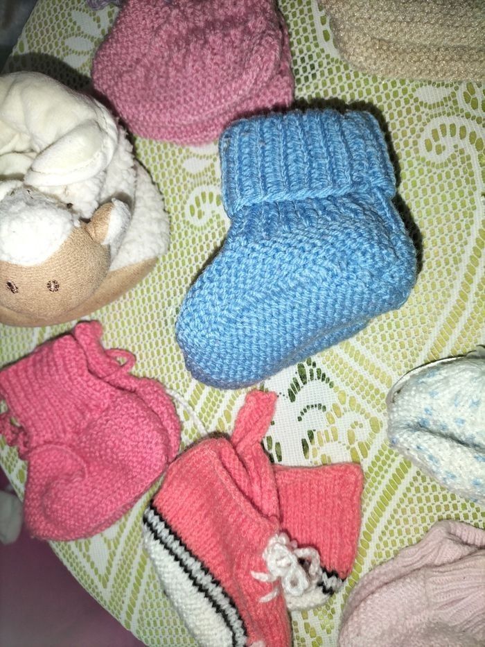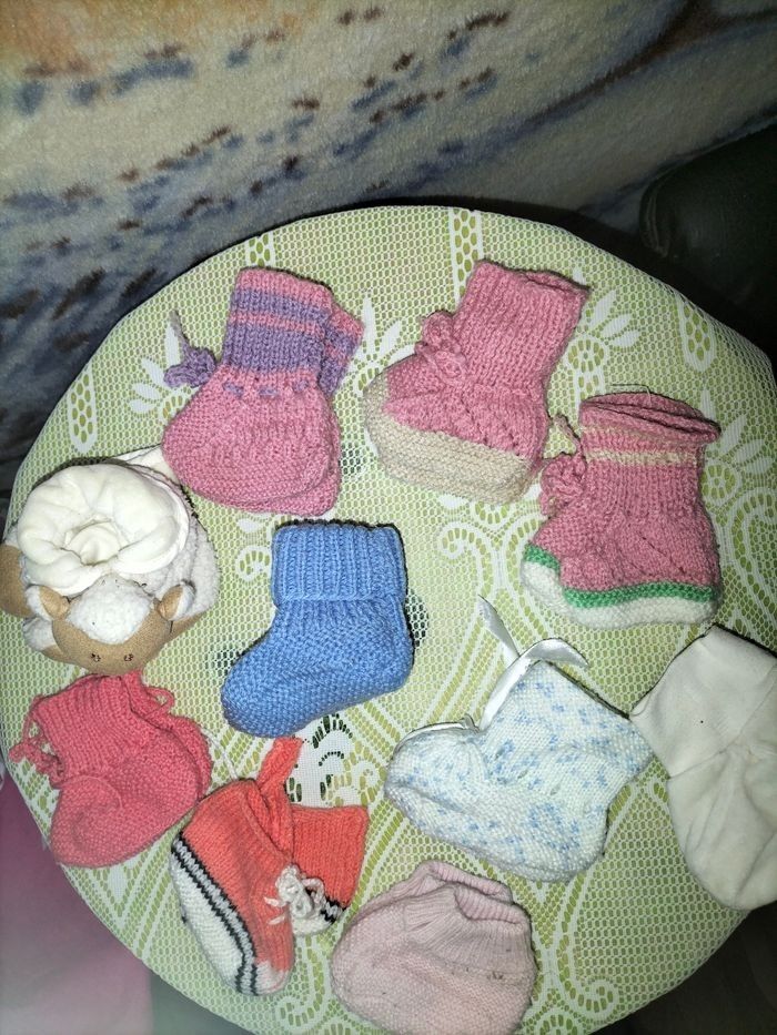 Lot de 10 paires de chaussons de bébé dont 8 sont en laine,et 4 paires de chaussettes. Je ne sais plus la taille, mais les bleus sont taille naissance, c'est sûr. Les autres je pense un peu plus grands.
