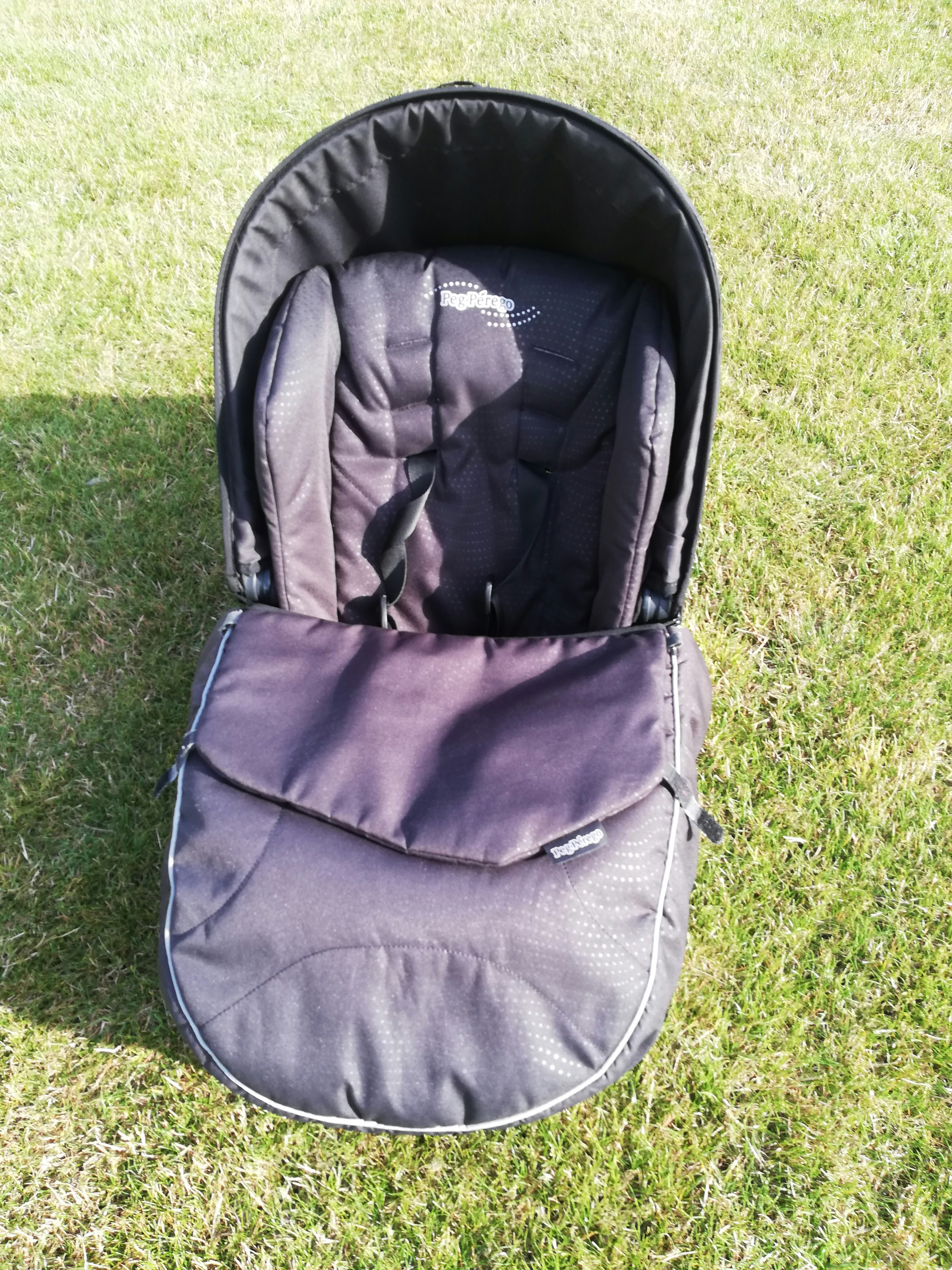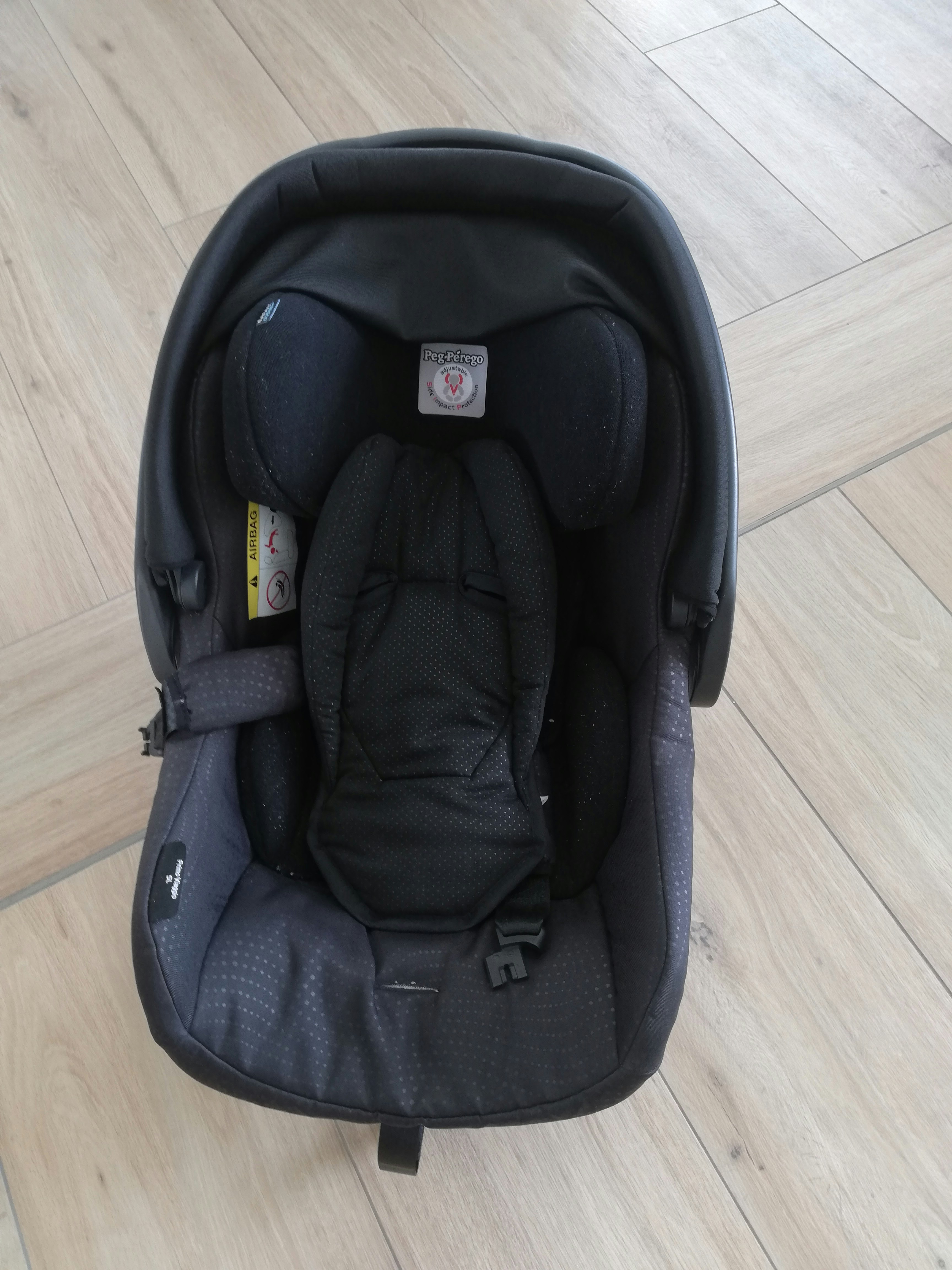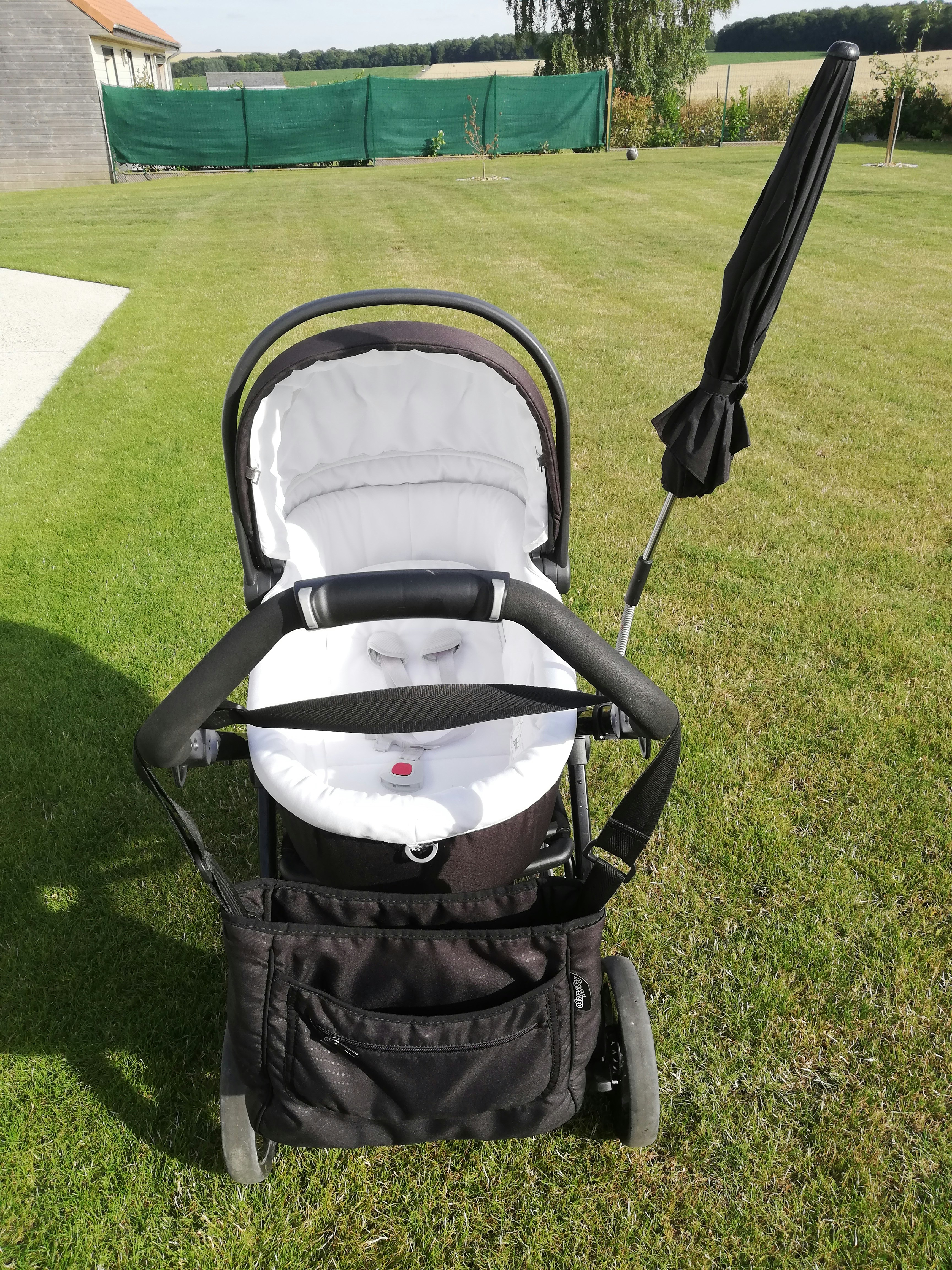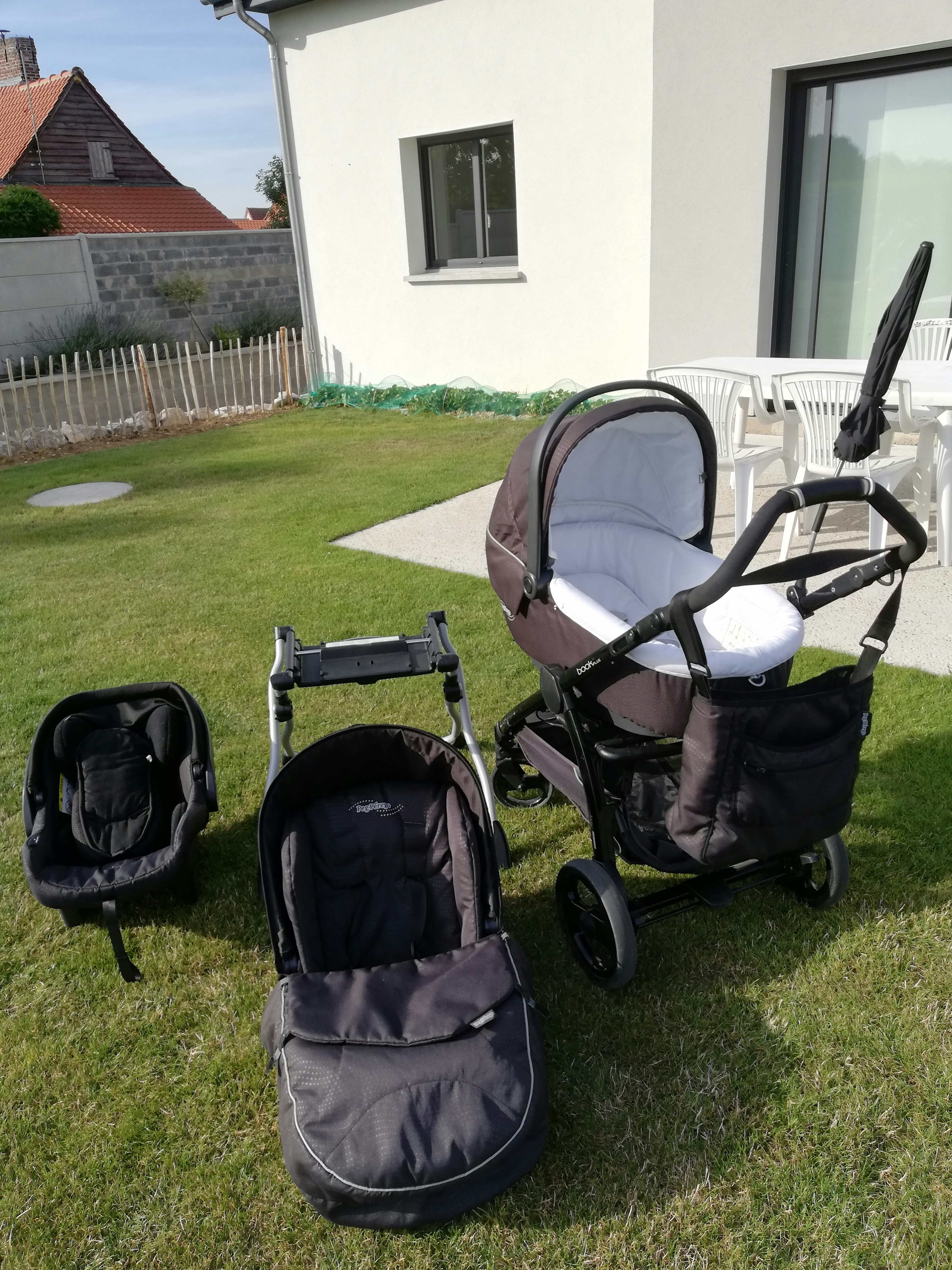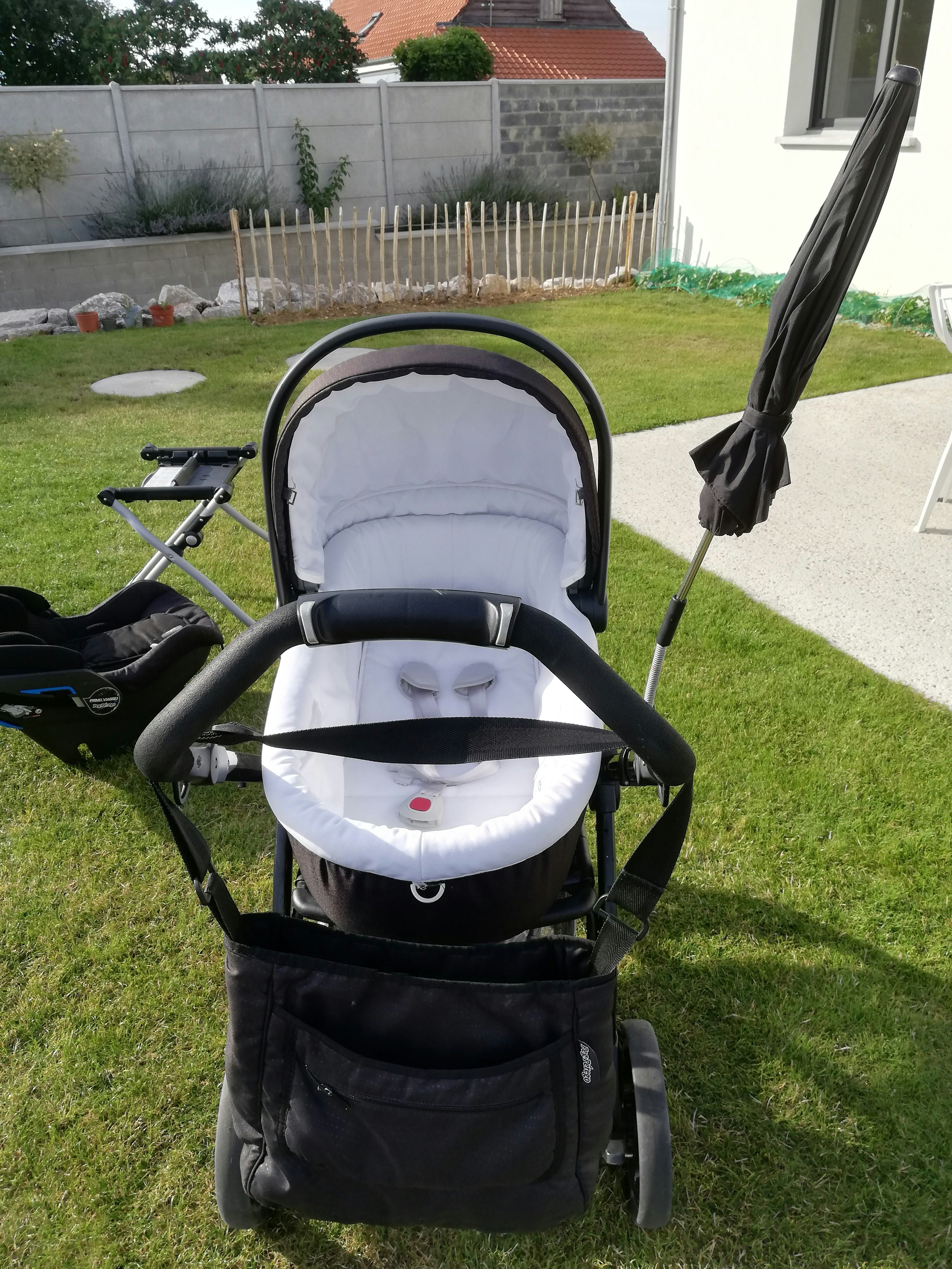 Vends trio Poussette peg perego book plus noir avec ombrelle, support roulant pour la nacelle, sac à langer. Bon état