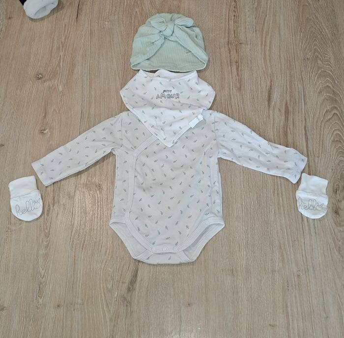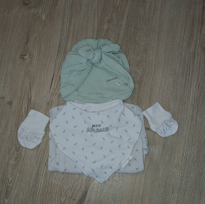 J'ai sélectionné un lot qui se compose : - un bodie - une bavette style bandeau - un bonnet - une paire de moufle Lot pour bébé de 1 à 3mois. Très bon état.