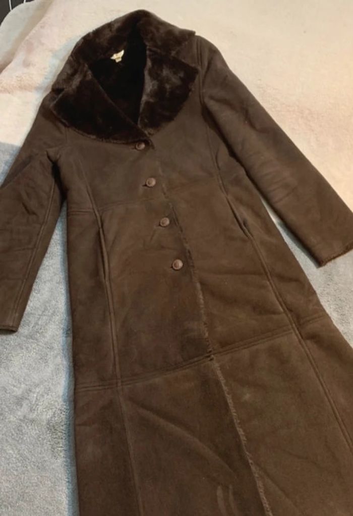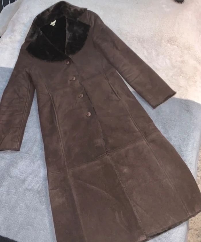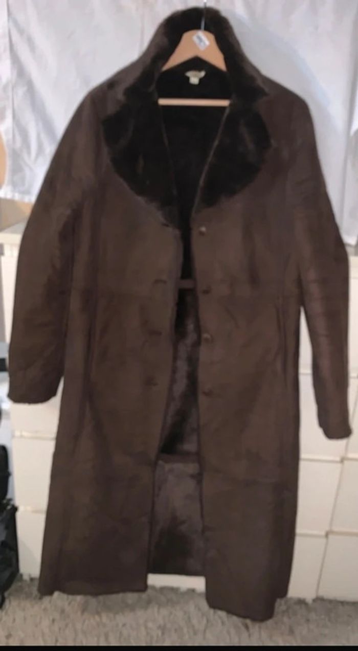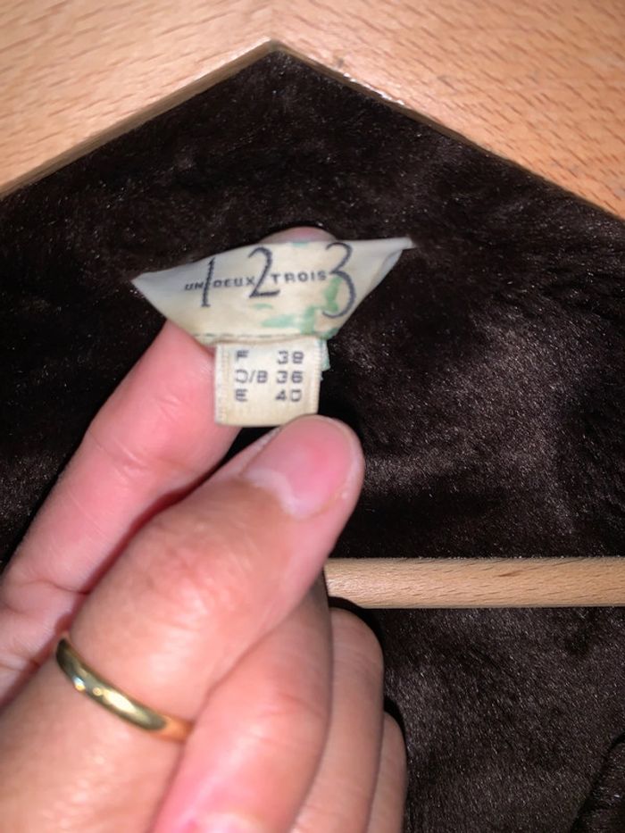 Très beau manteau très doux à l’intérieur comme à l’extérieur (très très bon état) Taille : 38 Marque : 1,2,3 Couleur : marron foncé Longueur : 120cm Dimension épaule : 42cm Dimension aisselles : 47cm