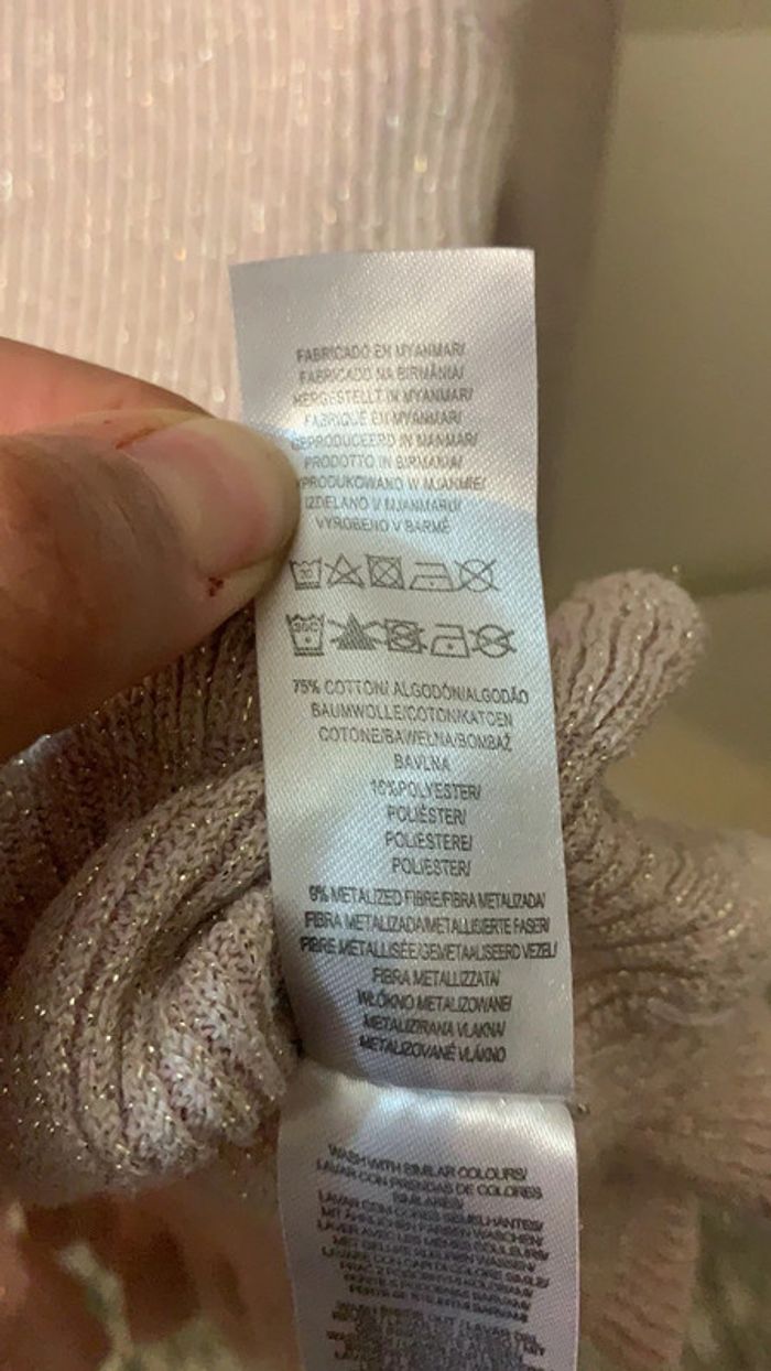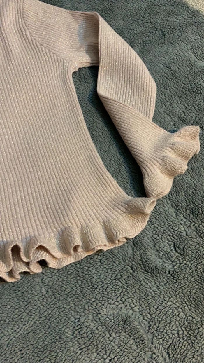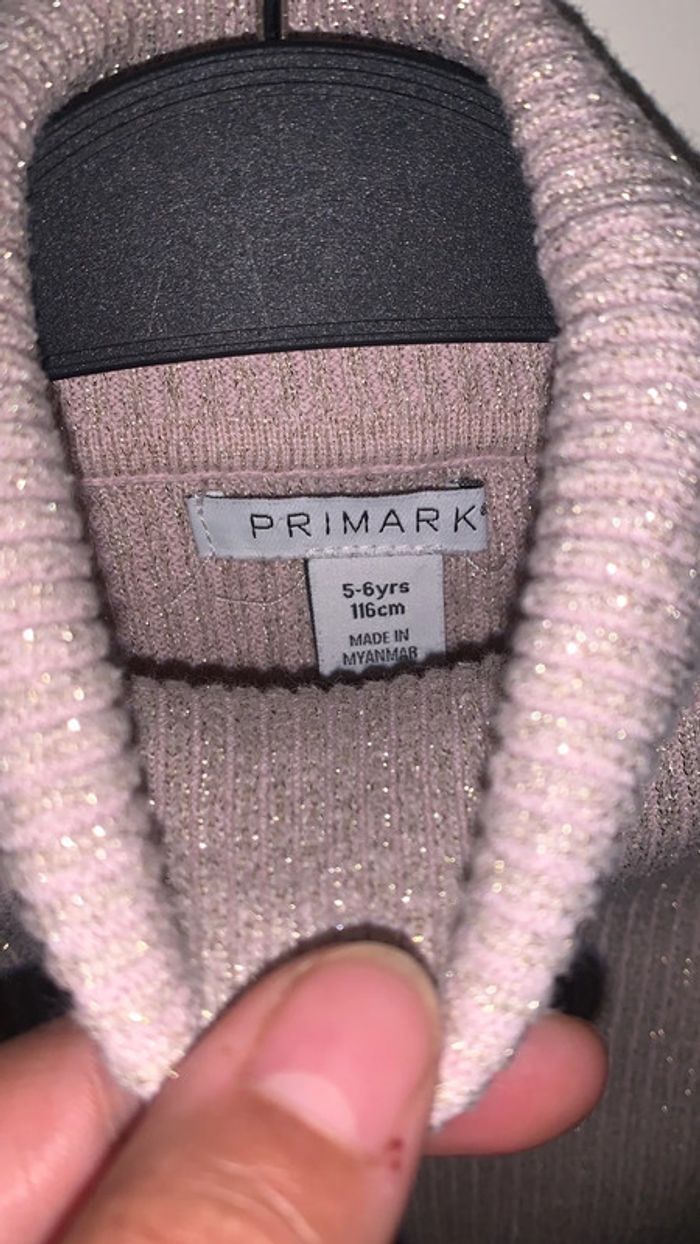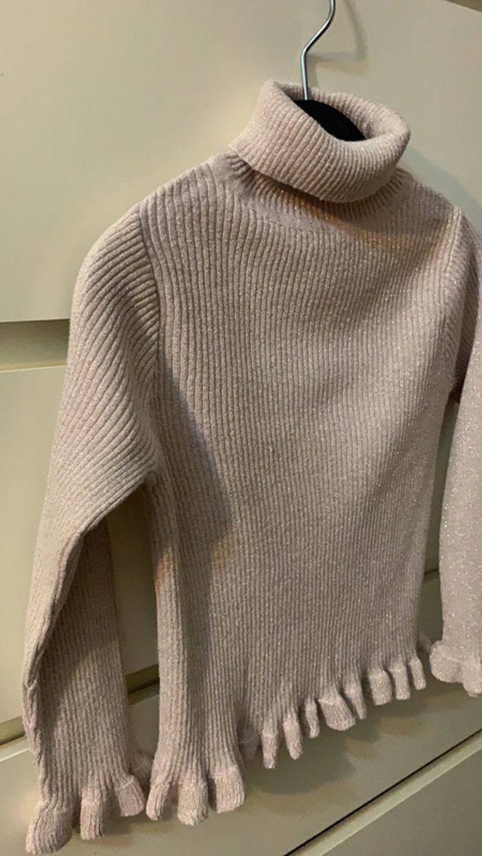 Très beau Pull col roulé pailleté, froufrous bas de manches et bas pull. Très bon état ! Taille : 5/6 ans Marque : Primark Existe dans mon dressing le même modèle rayé
