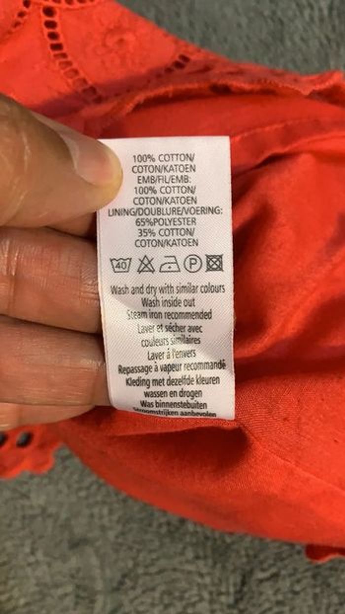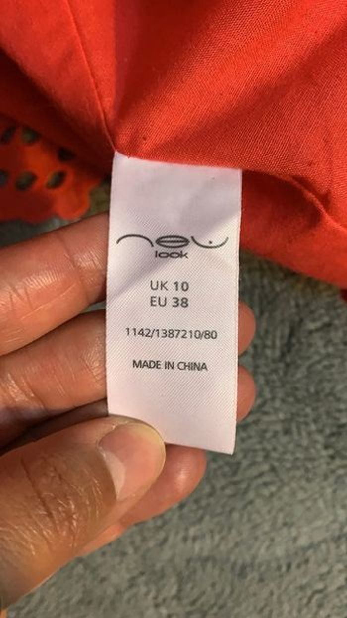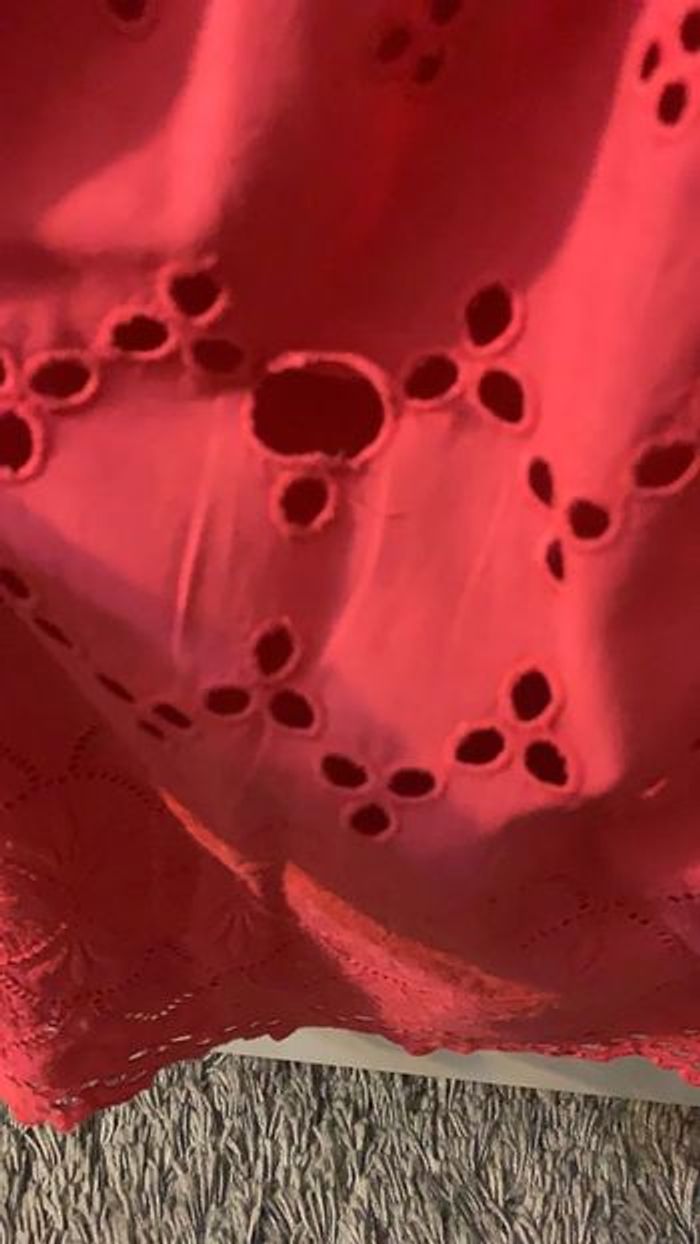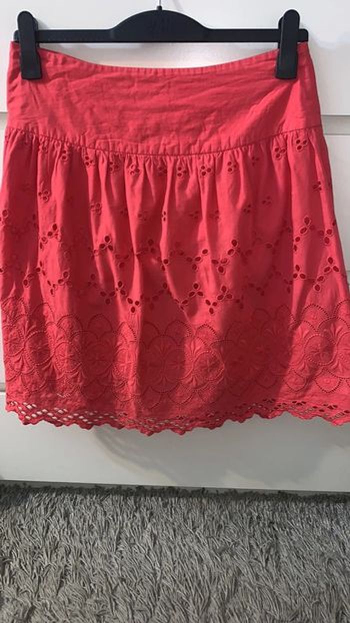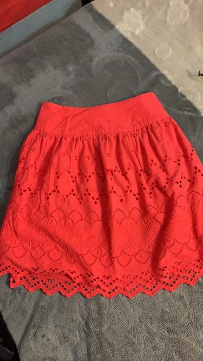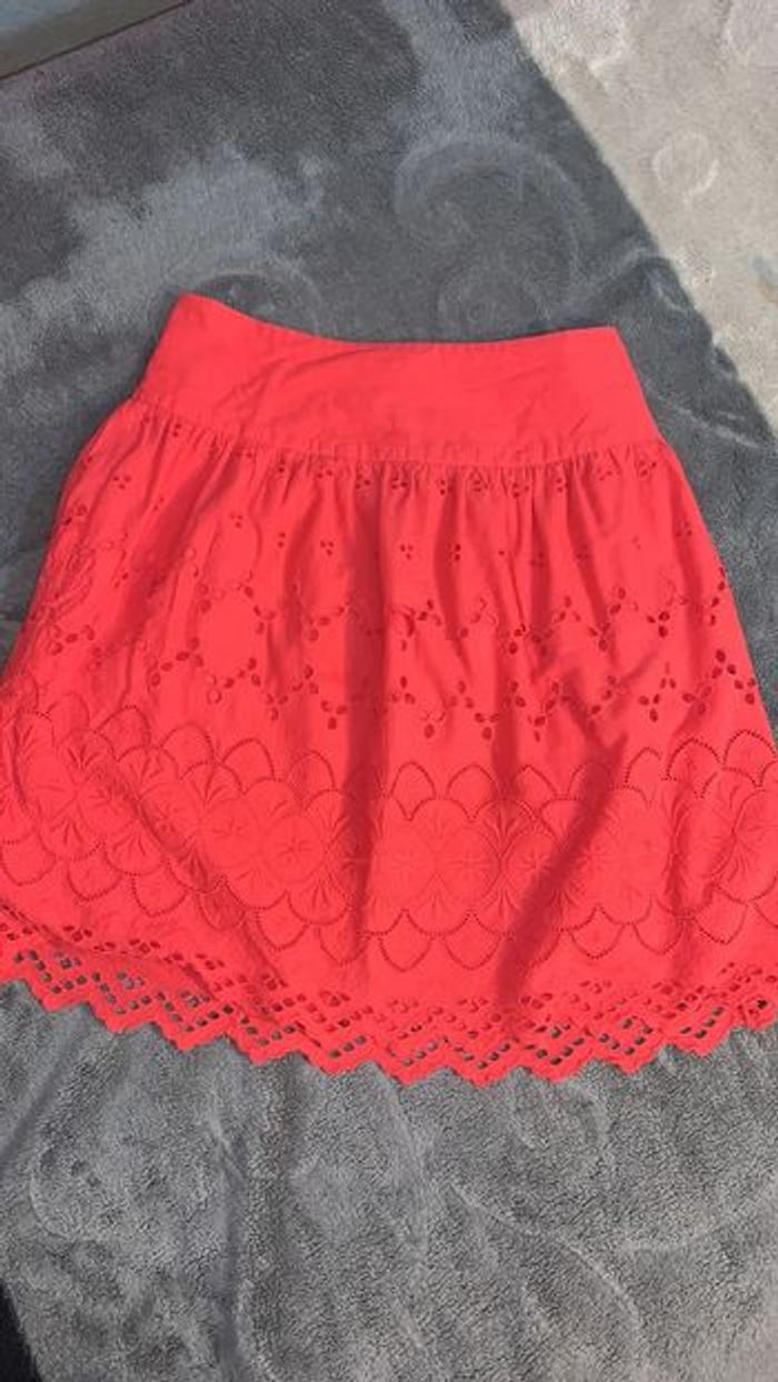 Jupe courte en bon état général, sauf une petite feuille cassée (voir photo) Taille : 38 Couleur : rouge Marque : New Look Longueur : 58cm