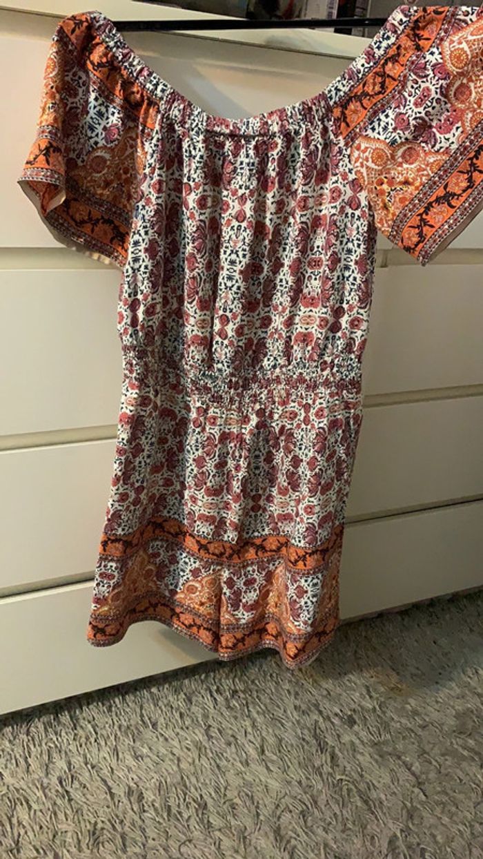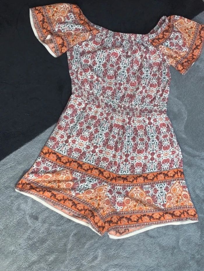 Très jolie combinaison short épaule dénudée et élastique à la taille. Très léger, fluide, et agréable à porter (tissu frais) Très bon état ! Taille : 38 Marque : Camaïeu