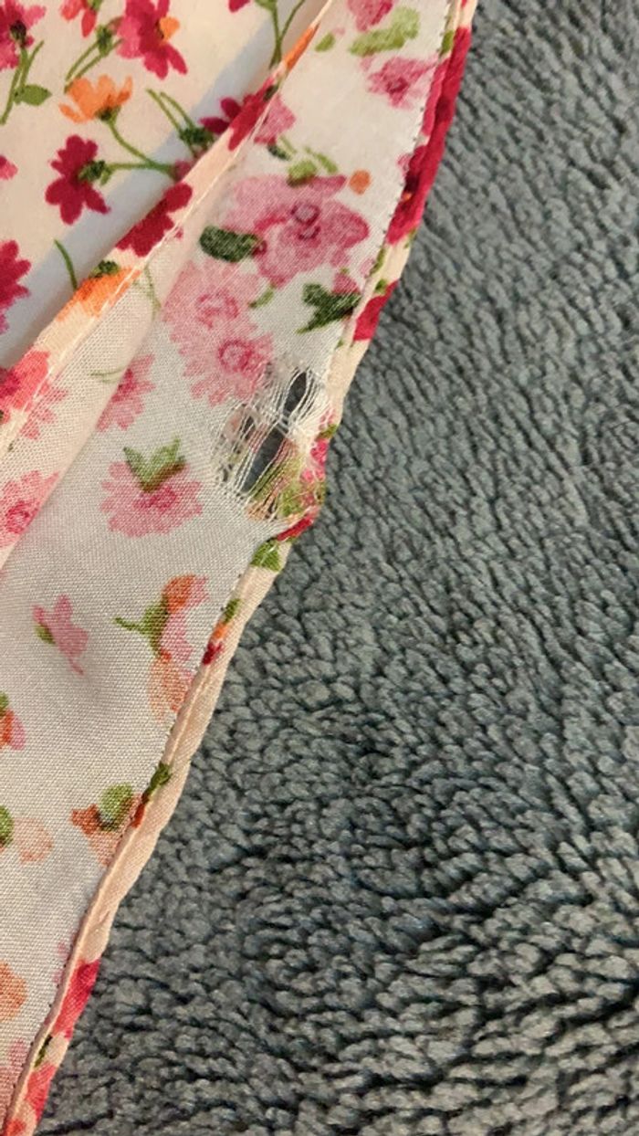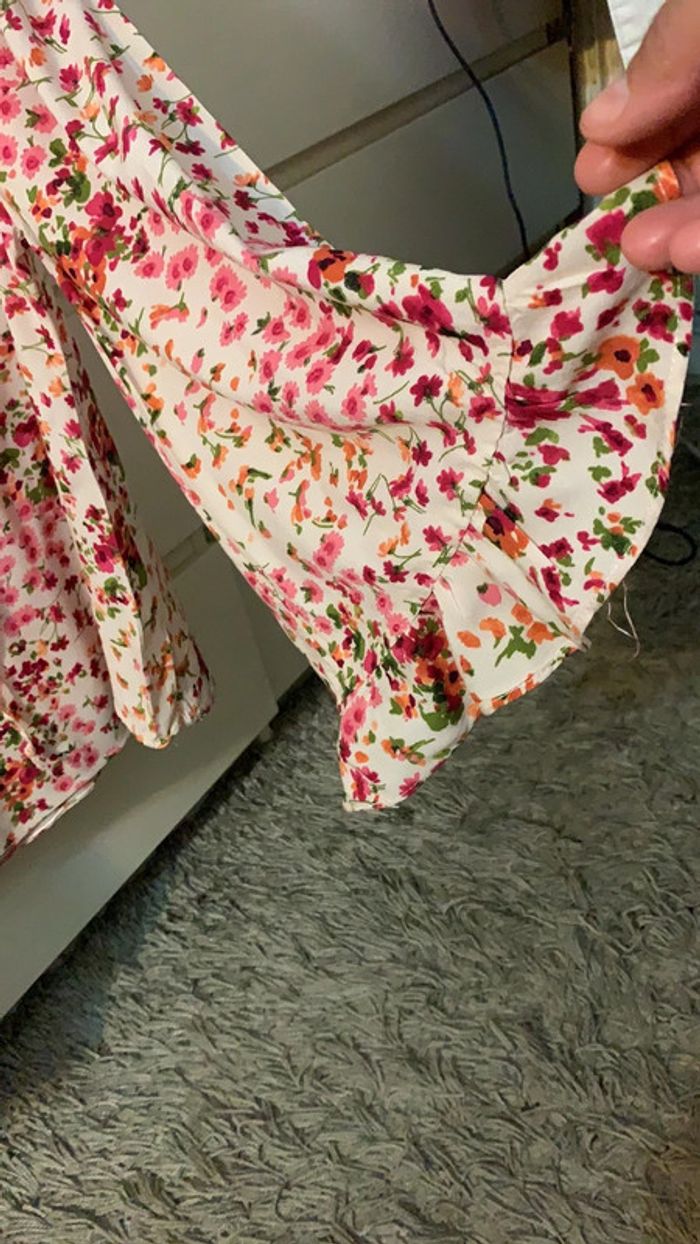 Magnifique blouse à fleurs, col V (en excellent état sauf mini défaut, voir photo) Manche large , tissu frais et fluide, agréable à porter. Taille : G sur l’étiquette (ce qui correspond a44