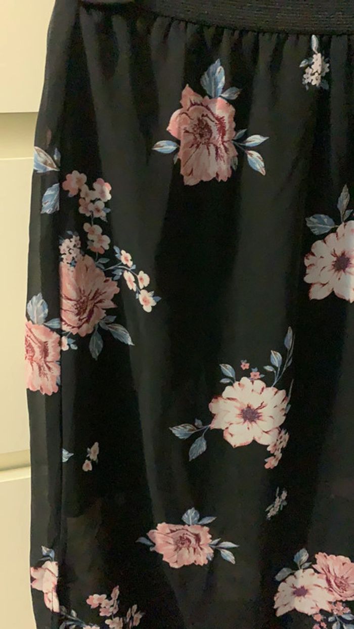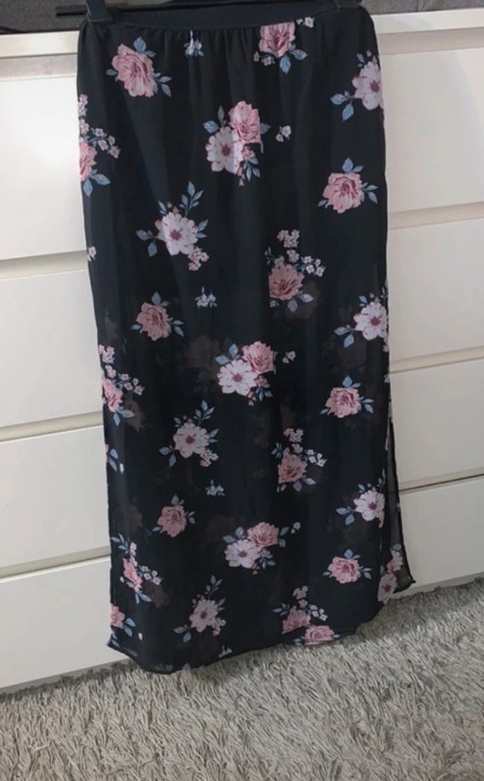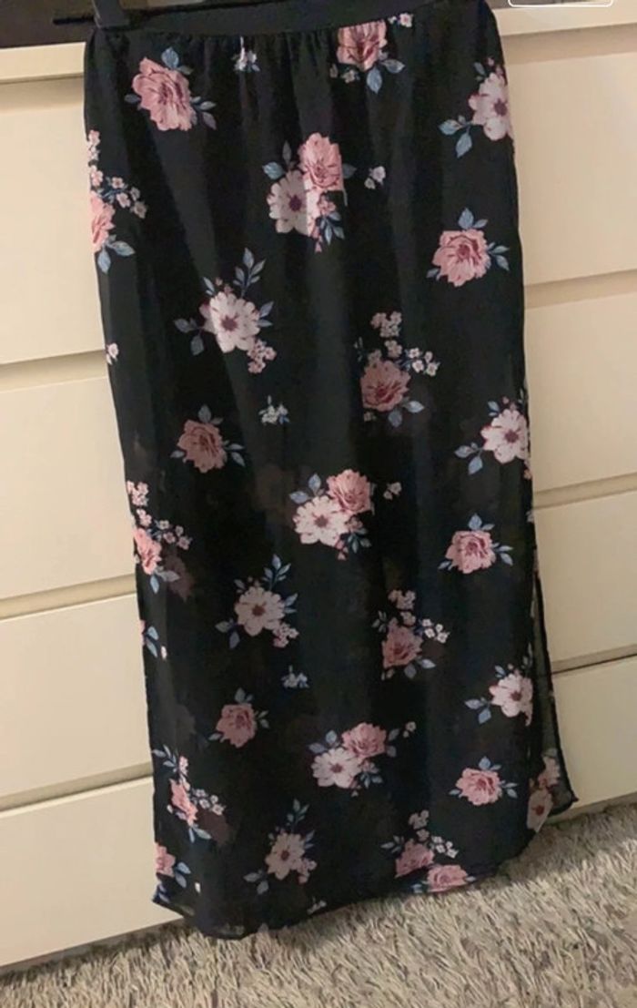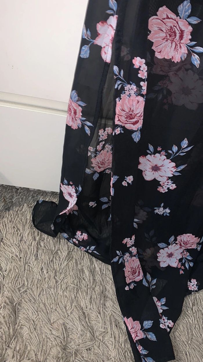Très jolie robe à fleurs transparentes, jupon mini jupe. Élastique à la taille. La jupe a 2 ouvertures sur les côtés jusqu’au niveau du jupon. Longueur : 95cm Ouverture de 54cm Marque : H&M