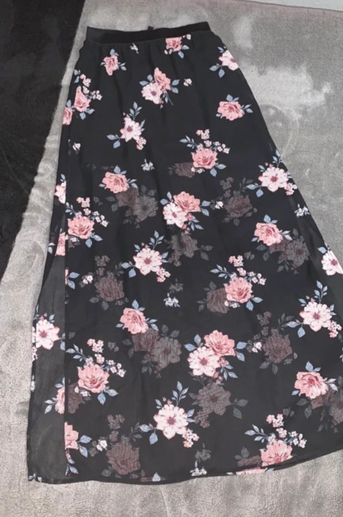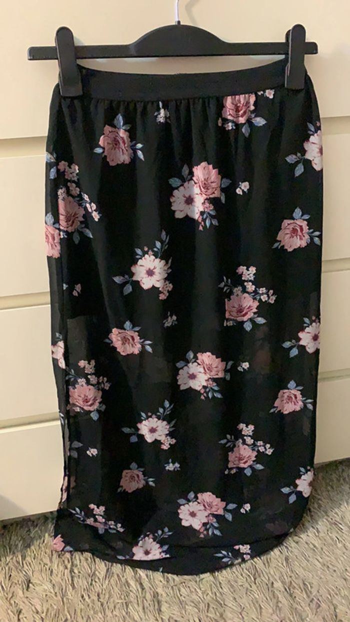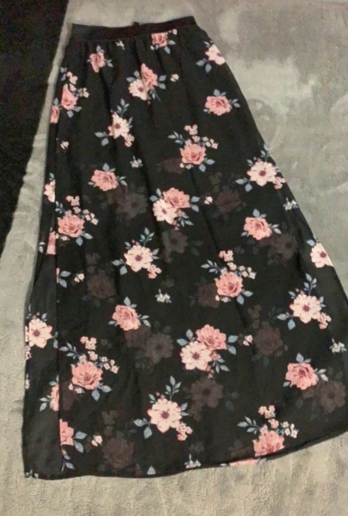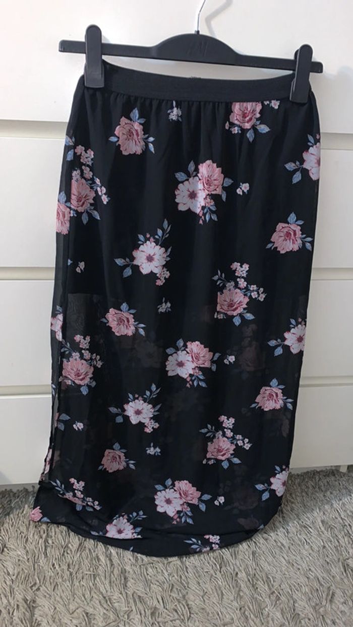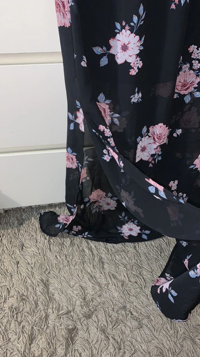 Très jolie robe à fleurs transparentes, jupon mini jupe. Élastique à la taille. La jupe a 2 ouvertures sur les côtés jusqu’au niveau du jupon. Longueur : 95cm Ouverture de 54cm Marque : H&M