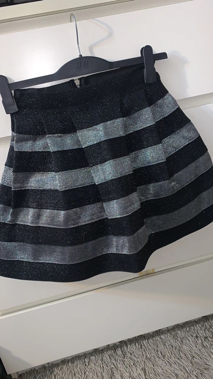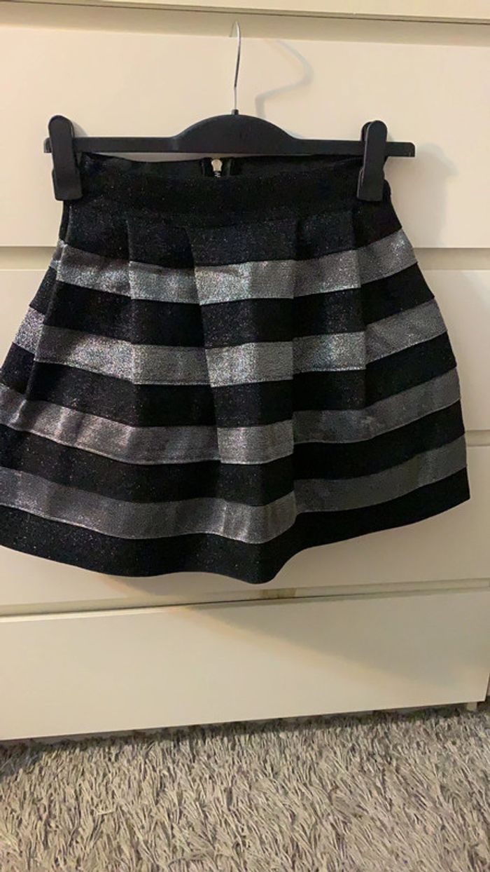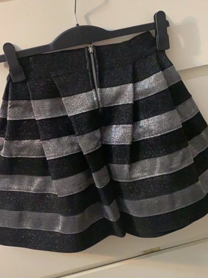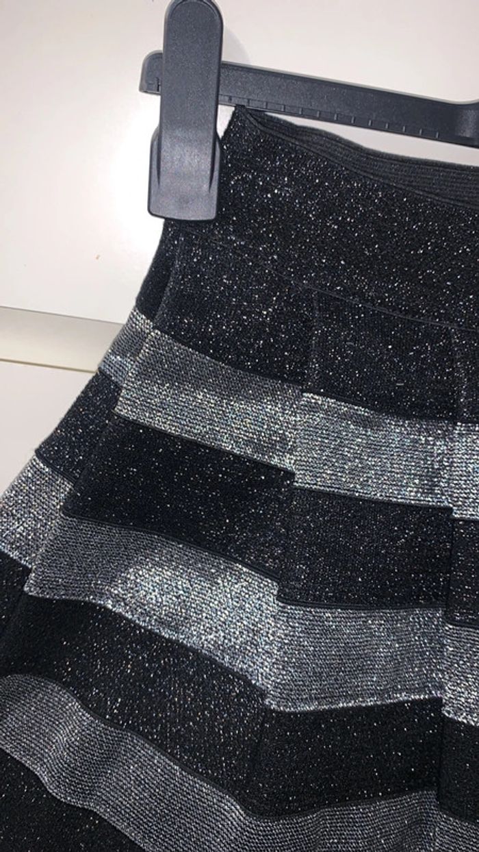 Magnifique jupe, matière tout en élastique Quasiment neuf (portée 1 fois) Taille : S Marque : Mim Couleur : noire et argenté Matière : polyester / elastane et fibre métallique