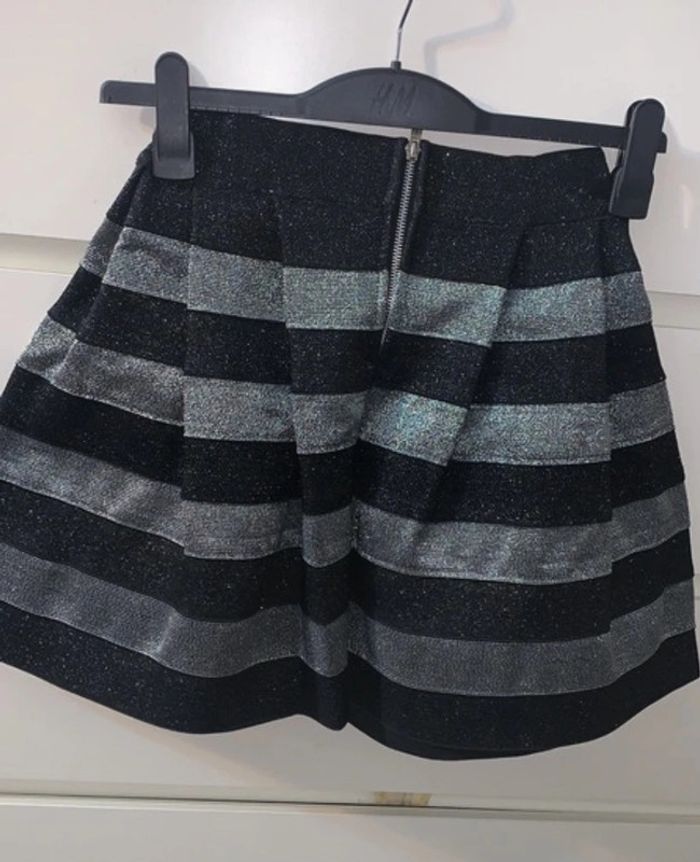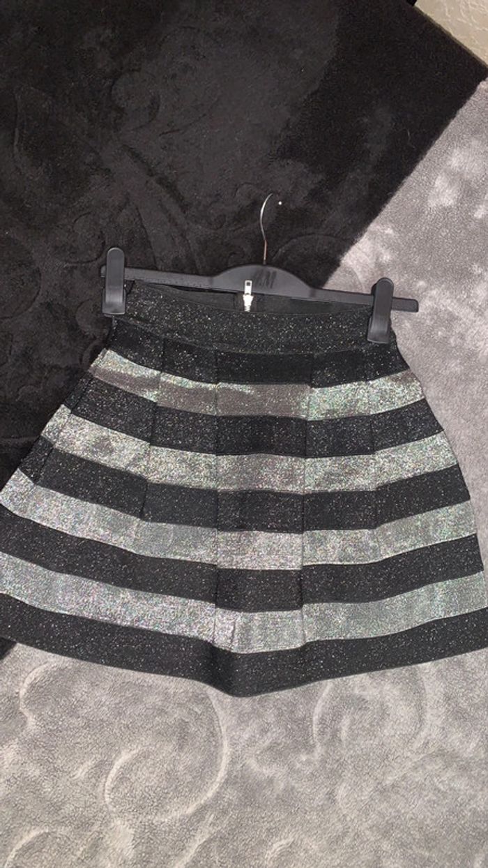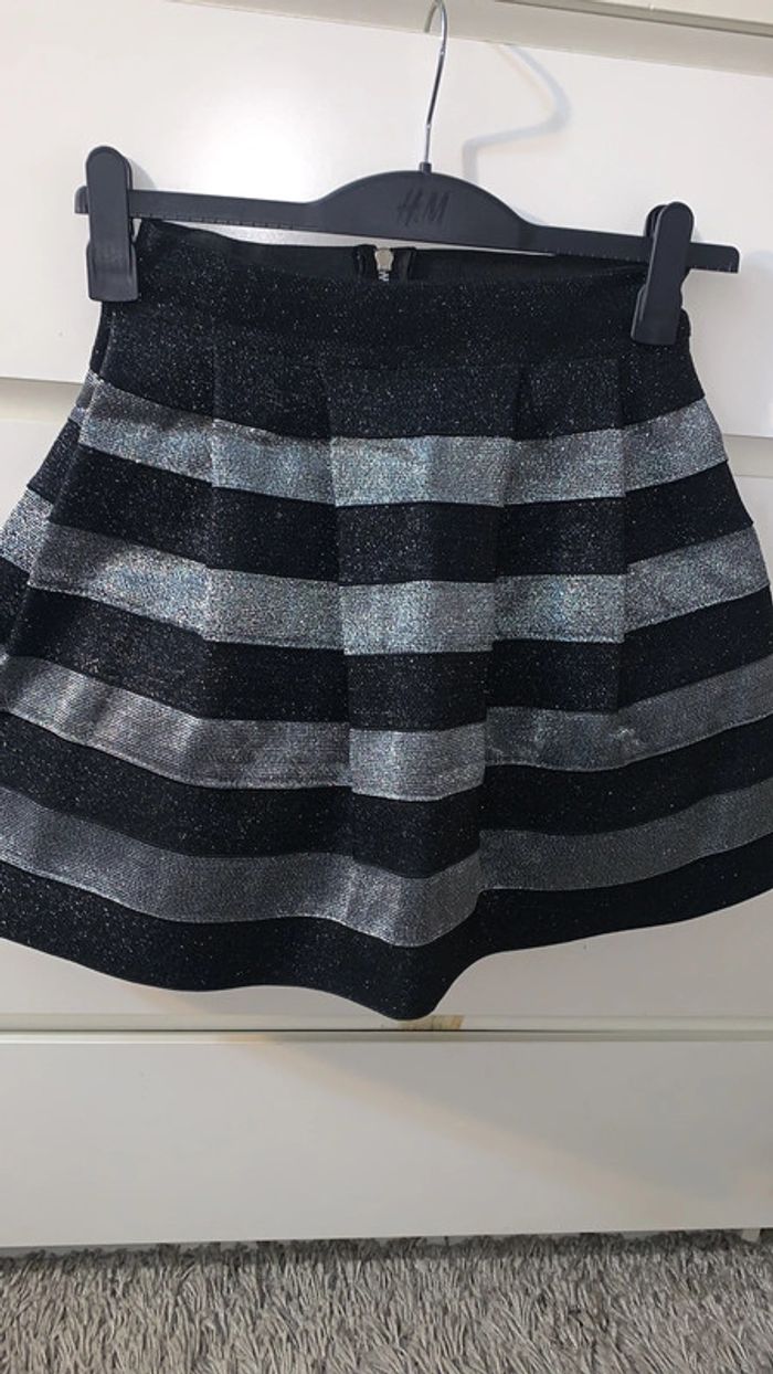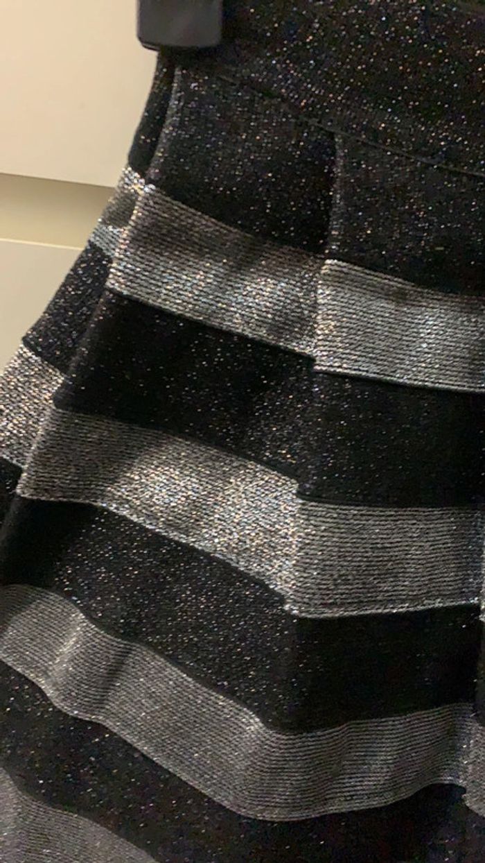 Magnifique jupe, matière tout en élastique Quasiment neuf (portée 1 fois) Taille : S Marque : Mim Couleur : noire et argenté Matière : polyester / elastane et fibre métallique