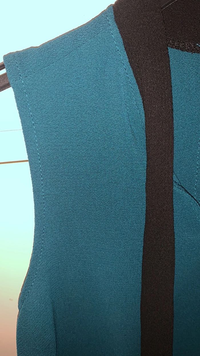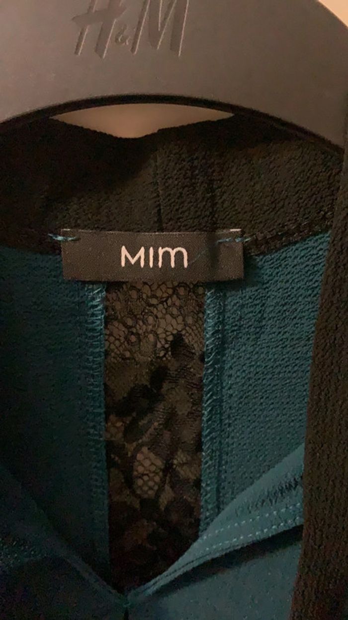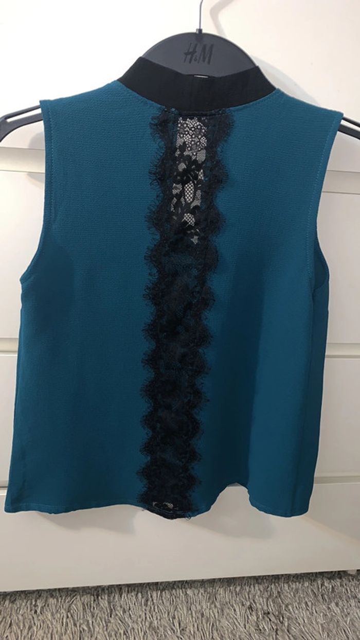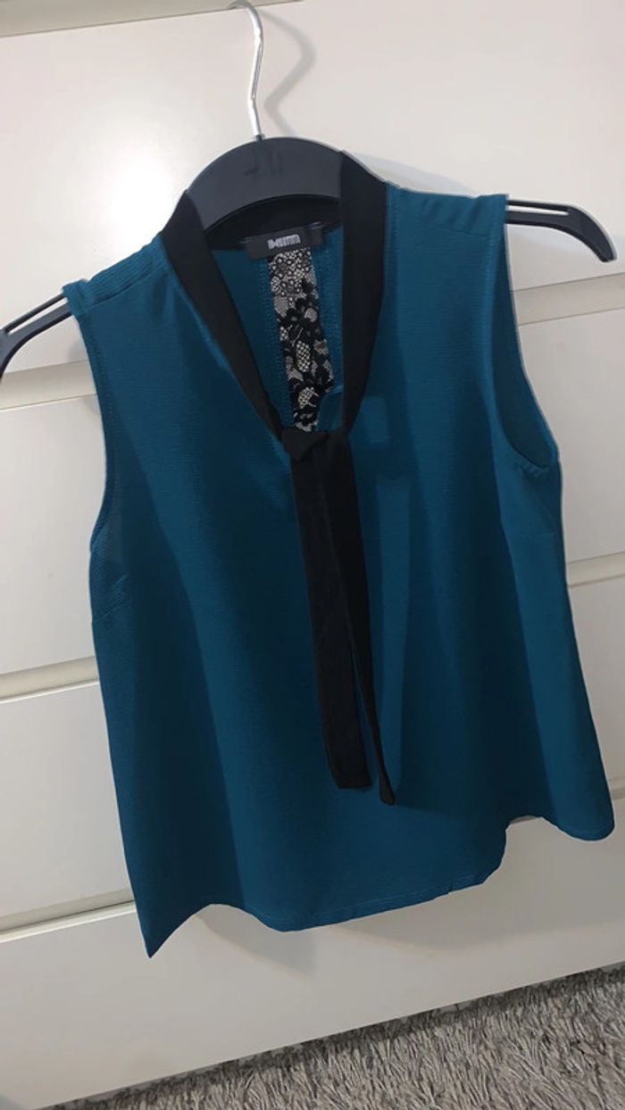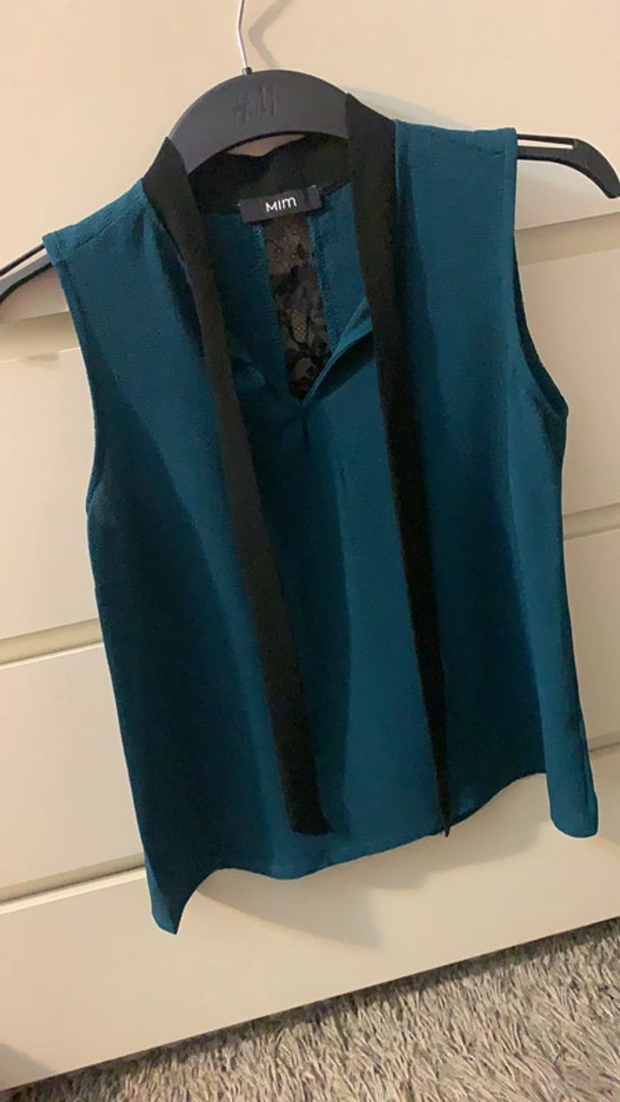 Joli haut , quasiment neuf ( très peu porté) Taille : XS je pense ( plus d’étiquette je vous donne donc les mesures afin de comparer avec vos vêtements) Mesure épaule : 30cm Mesure aisselles : 41cm Longueur : 57cm Couleur : bleu canard Marque : Mim