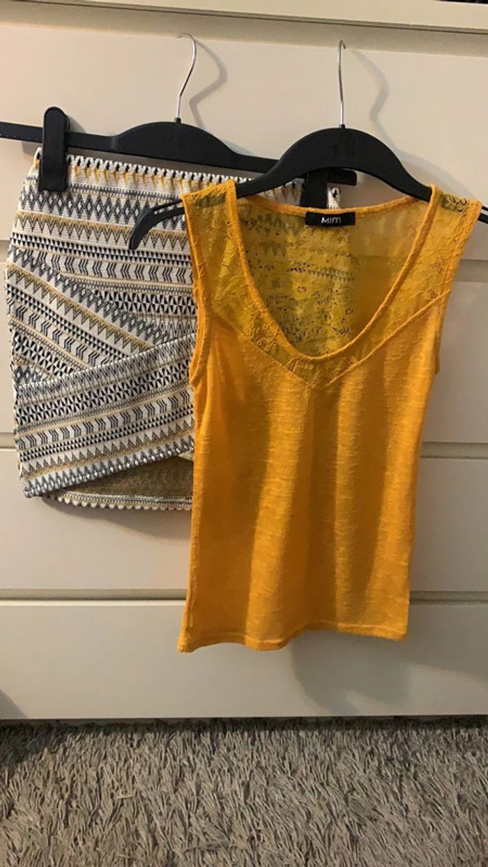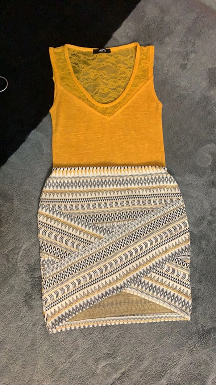 Mini jupe élastique à la taille Marque : Pimkie Taille :XS (plus d’étiquette je vous donne les mesures pour comparer avec vos vêtements) Mesure ceinture jupe : 31/32cm Longueur : 39cm Je vous ai publié pour vous donner une idée 2 dernière photo le modèle du haut qui était porté avec la jupe vendu séparément.