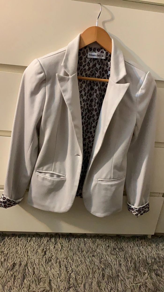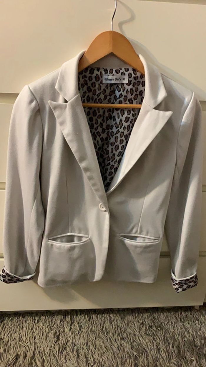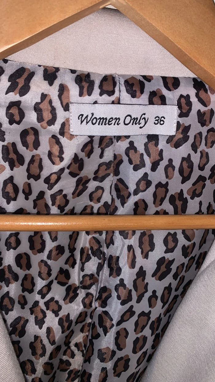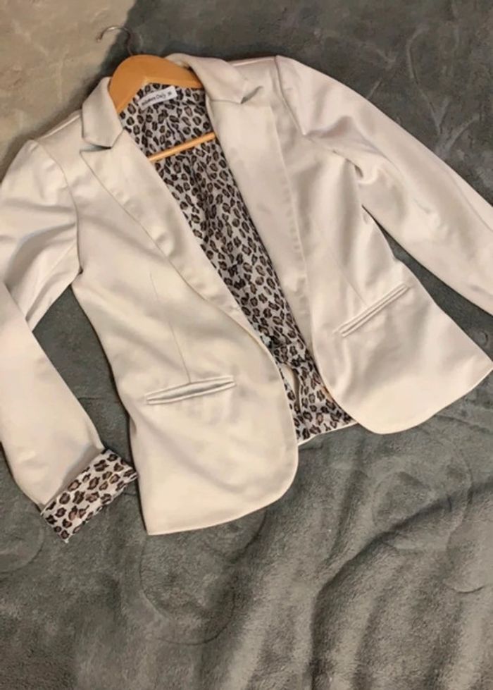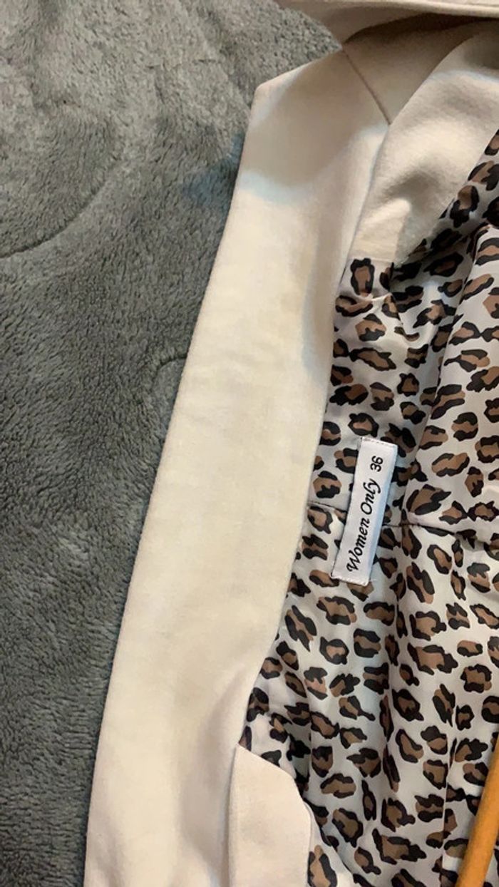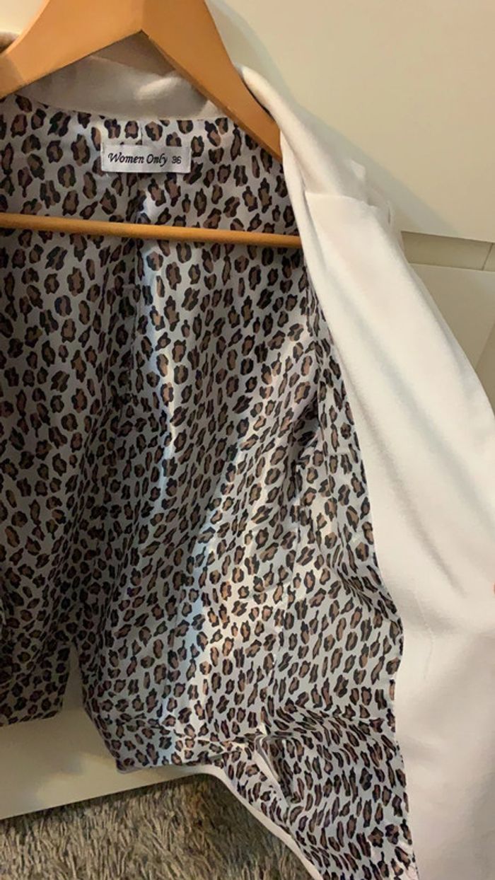 Jolie veste avec doublure léopard, très bon état ( juste le col un peu jauni mais se voit même pas (voir photo) Taille : 36 Marque : Women Only Couleur : blanc/ blanc cassé (je ne vois plus très bien) voir photo
