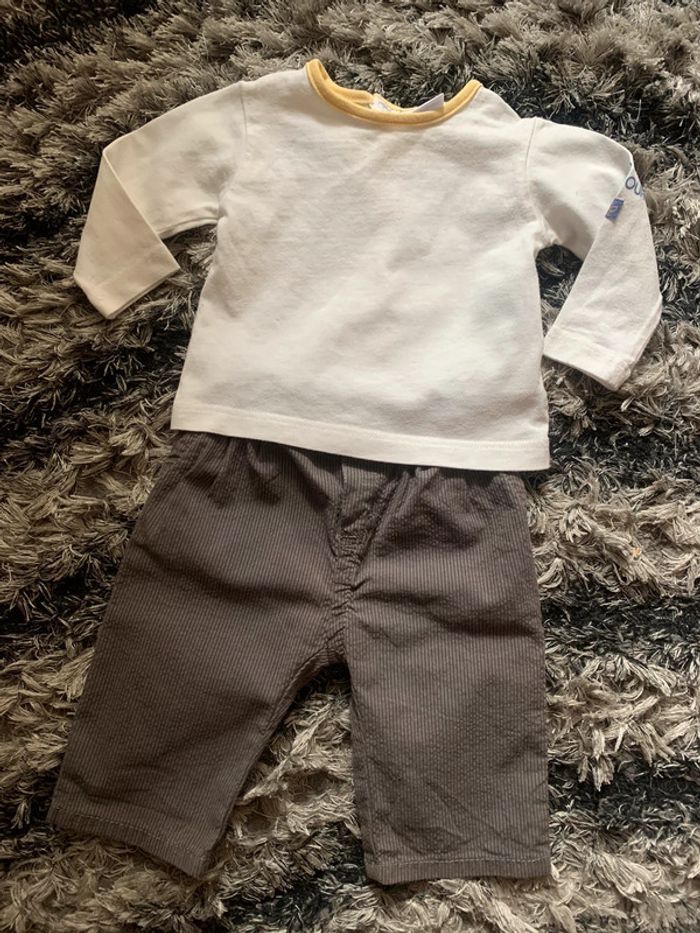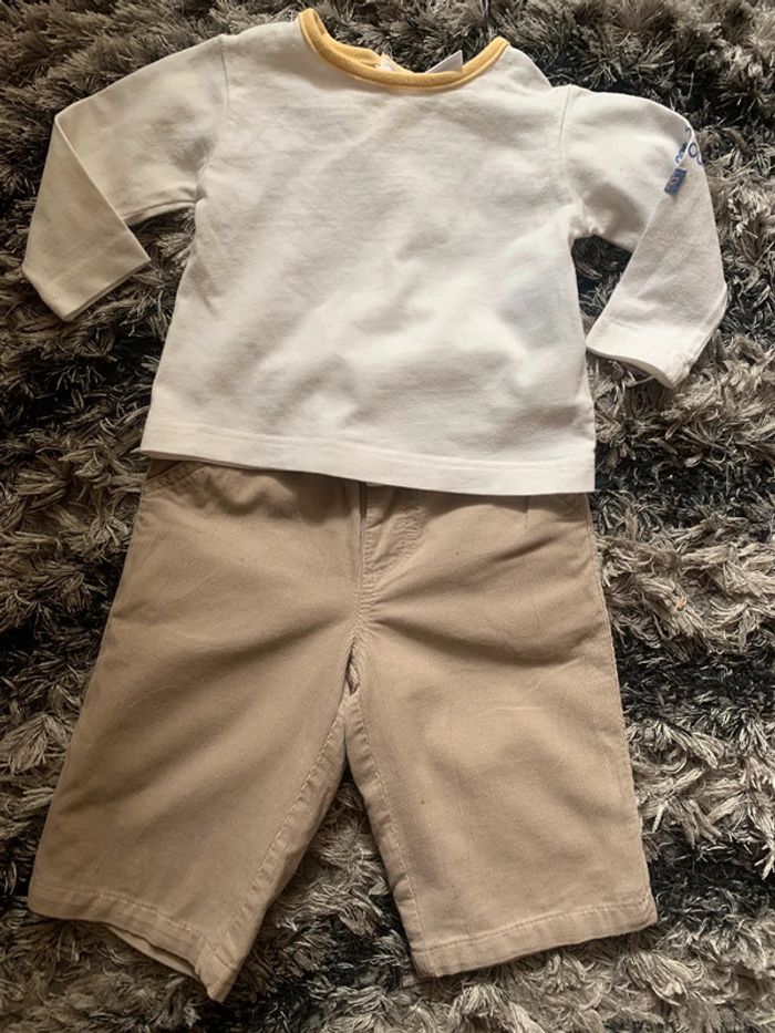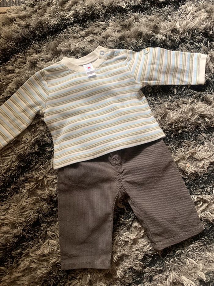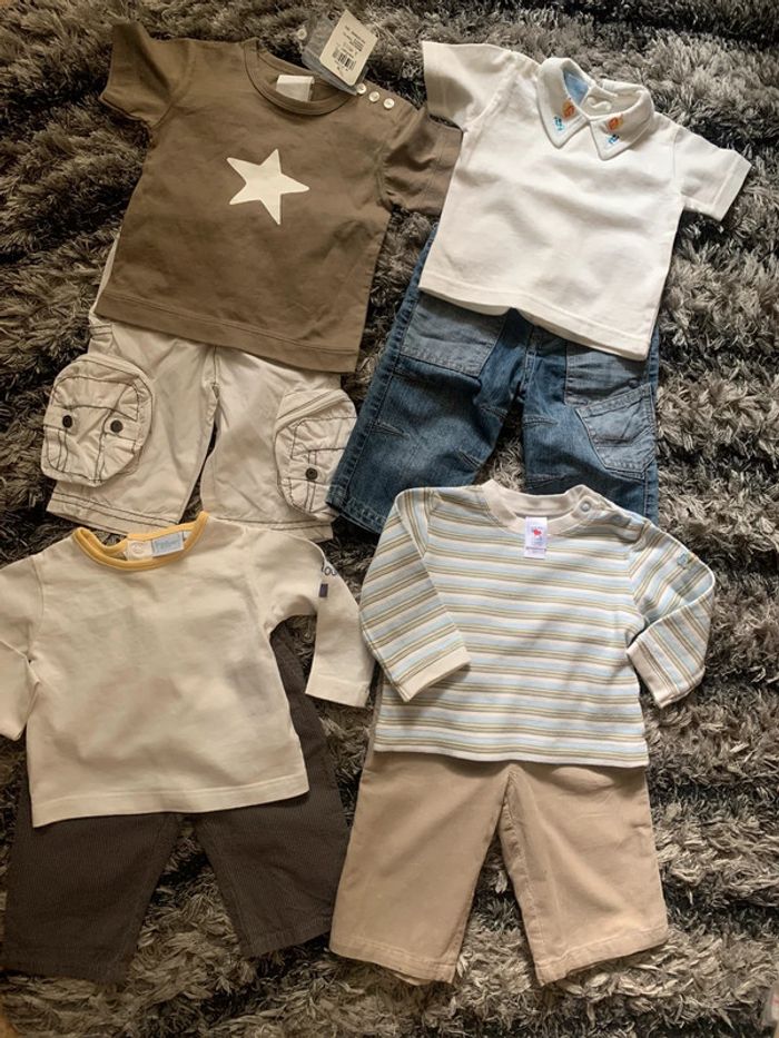 Lot de 4 ensembles bébé garçon (bas +haut) Dont 1 ensemble offert Taille : 3 mois (0/62cm) Marque pantalon : tape à l’œil / petit bateau et du pareil au même . Marque haut : baby club /Disney /Agnès b les bébés d’Élysées. 100% coton Possibilité de vendre à l’unité (7€ l’ensemble )