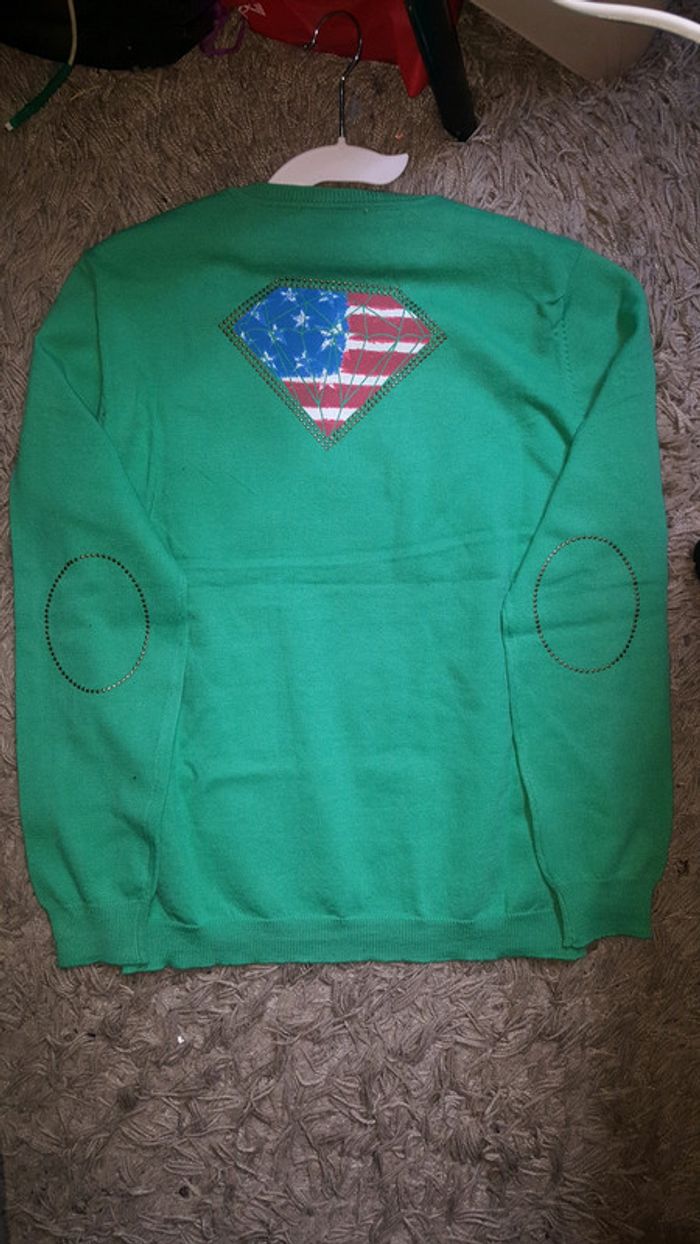 Pull col V jamais porté Tissu stretching Modèle a la mode Couleur : vert( existe en bleu turquoise et marron clair ) Taille : 10/12ans N'hésitez pas si besoin de photo ou réponse à vos questions.