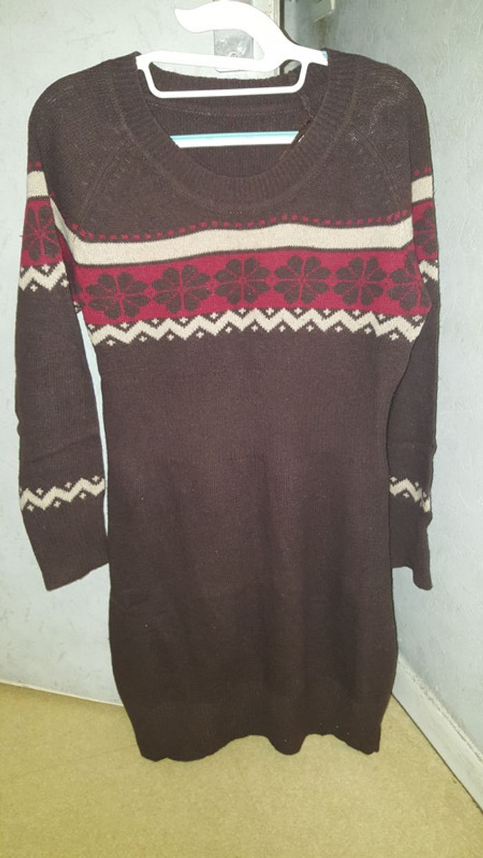 bonjour je vends cette robe/tunique laine. elle va jusqu'au dessus des genoux hauteur 86cm Couleur : marron/rouge/beige Taille : 38/40