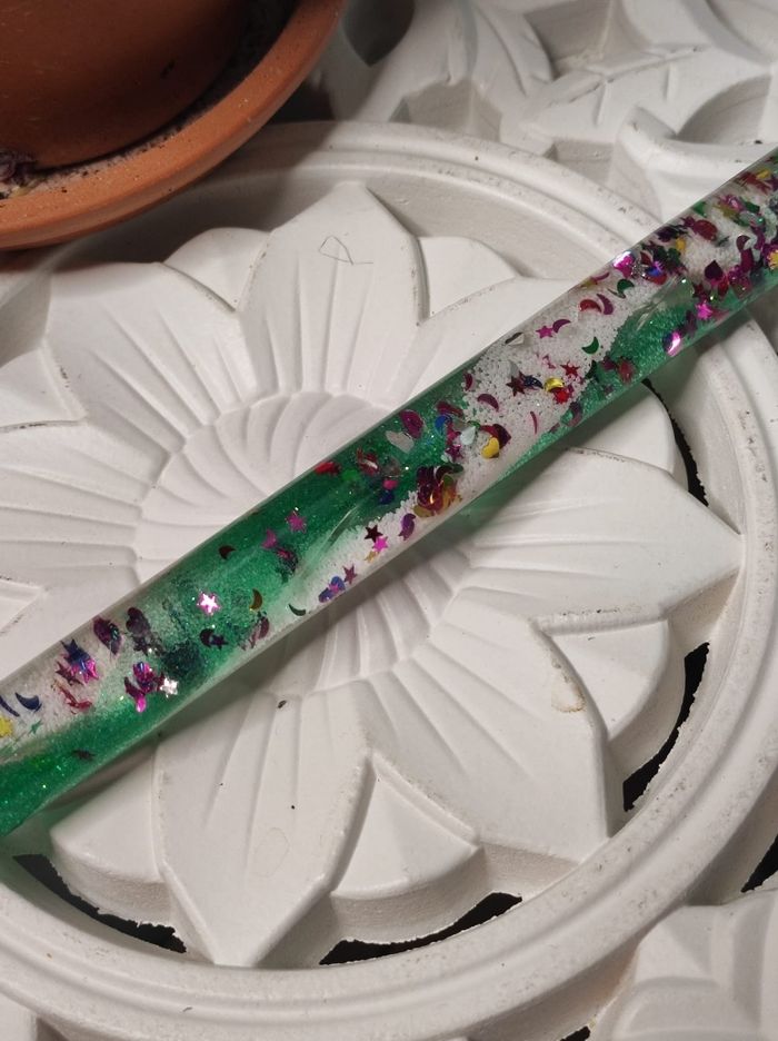 Bâtonnet magique a spirale de paillettes. Mesure 32 cm Couleur vert/blanc