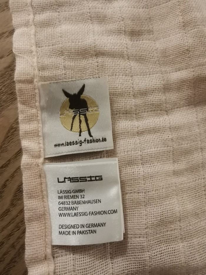 Lange LÄSSIG 85 cm x 85 composé à 100 % de coton. Il est respirant, facile d’entretien et s’utilise comme doudou, lange ou bien comme protection d´épaule. Le lange est lavable en machine à 60 °C. Neuf jamais servie.