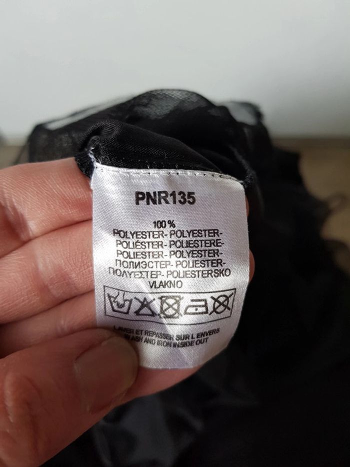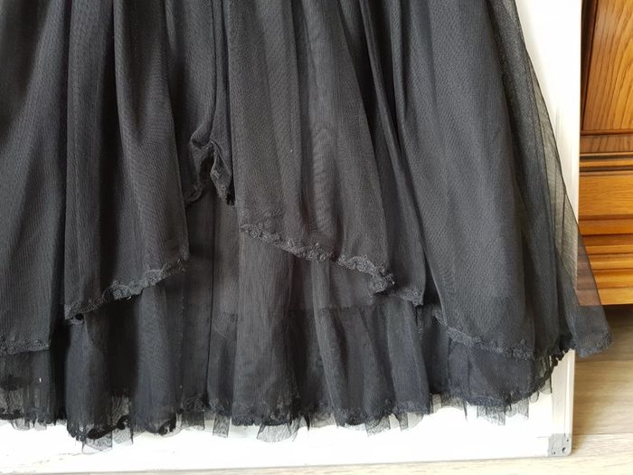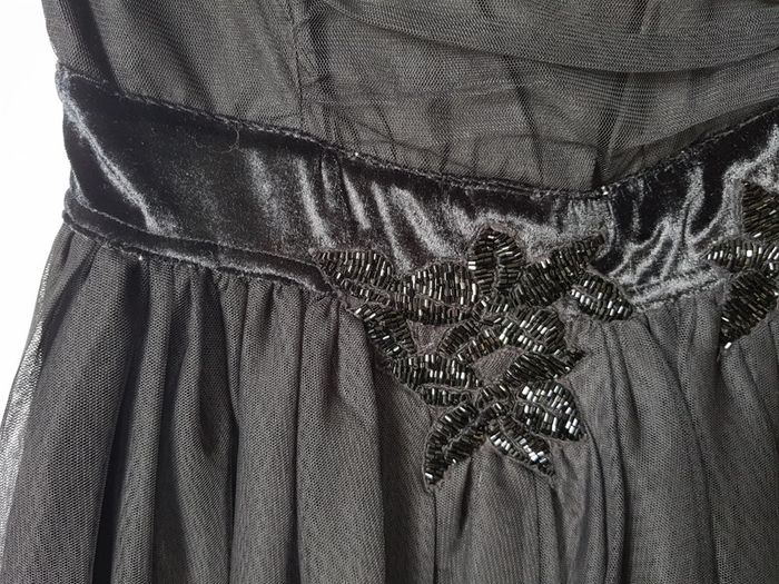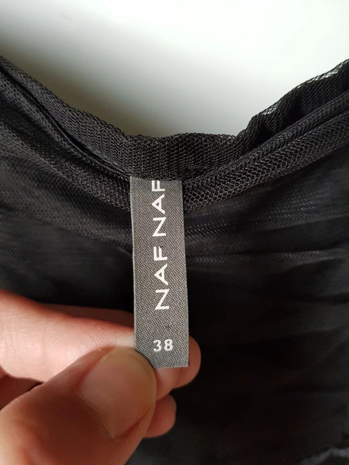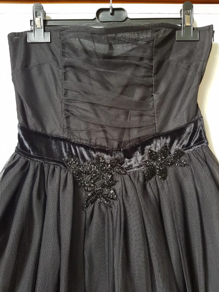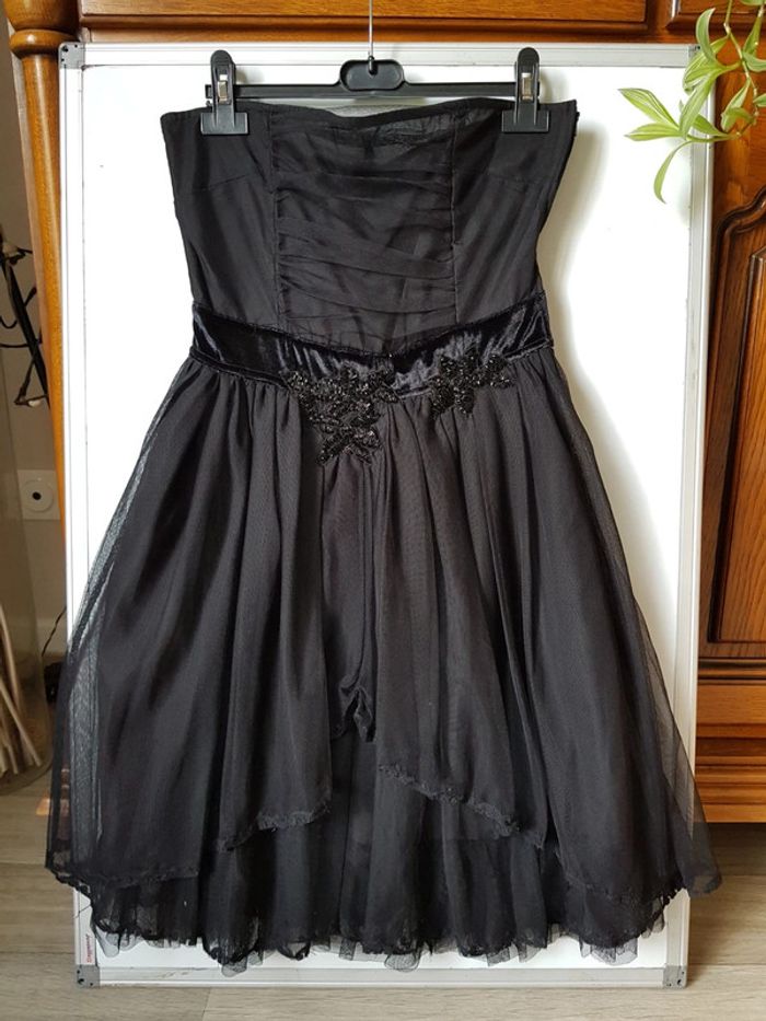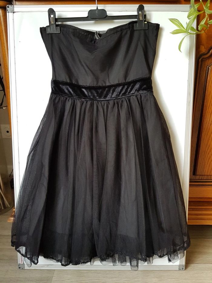 Robe bustier, noire, cintré à la taille avec sa ceinture de perle et effet velour, un peu bouffante sur le bas avec son tule, fermeture latéral et crochet, 100% polyester Environ 80 cm de long Pour occasion, style : nouvel an, anniversaire... T.38 / NAF NAF / femme #boulie2318taille38 / #robesboulie2318