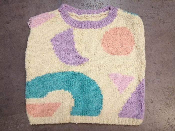 pull en coton tricoté main 4 ans Phildar multicolore. Largeur 34 cm. Longueur 33 cm