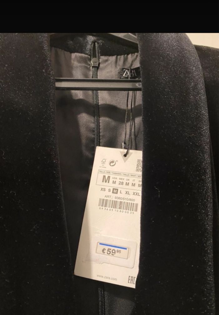 ✨ Élégante robe en velours noir signée ZARA, neuve, avec étiquette d’origine. 💸 Valeur boutique : 59,95 € 🎨 Couleur : noire 🏷️ Marque : Zara 📐Taille : M/38 👗Col en V cache cœur chic et Manches longues avec épaulettes structurées 🔒 Fermeture au dos 📏 Dimension :Aisselle à aisselle : 48 cm, Longueur des manches : 64 cm 🧵 Composition : 93% polyester – 7% élasthanne 🏷️ État : Neuf, avec étiquette