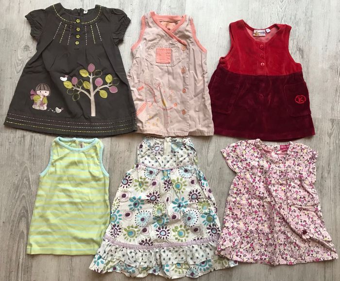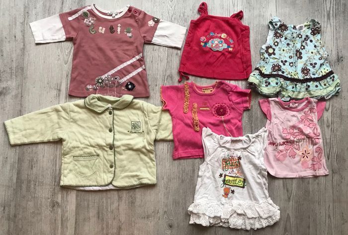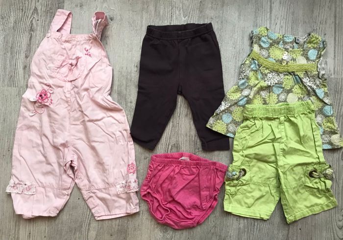lot de vêtements pour fille taille 6 mois -6 robes -1 ensemble short -1 salopette -2 bas cache-couche (un n’est pas sur les photos en taille 9 mois mais petit, couleur fuchsia) -1 legging -1 tee shirt manches longues -5 tee-shirts manches courtes -1 gilet présence de traces d’utilisation certains plus que d’autres occasion, bon état général