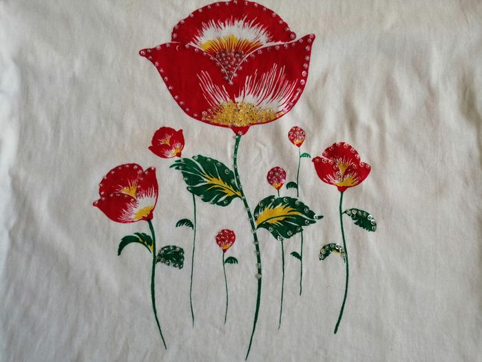 Largeur 47 cm, longueur 61 cm. Juste petite tache sur la manche prise en photo. Très beaux dessins