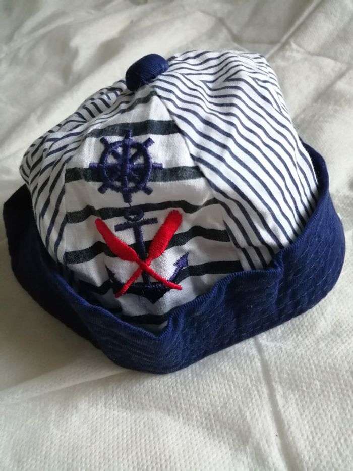 toile marine et blanche. Elastique pour le menton. Prenom écrit sur l'étiquette