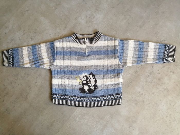Pull bleu écru et gris 4/8 ans tricoté main - photo numéro 1