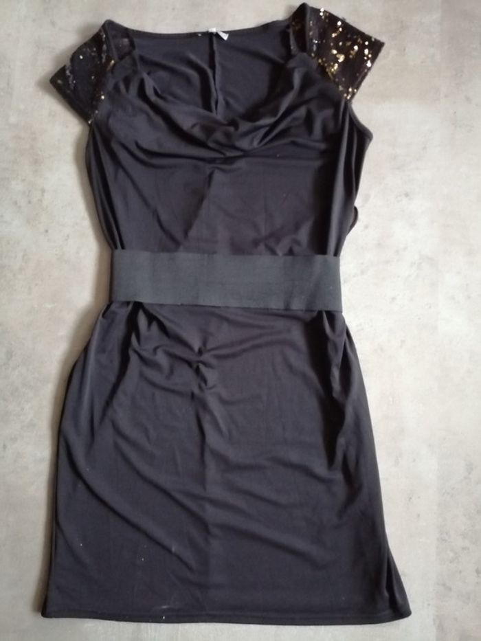 Avec ceinture. Très belle avec sequins aux épaules. Longueur 88 cm. Neuve jamais portée