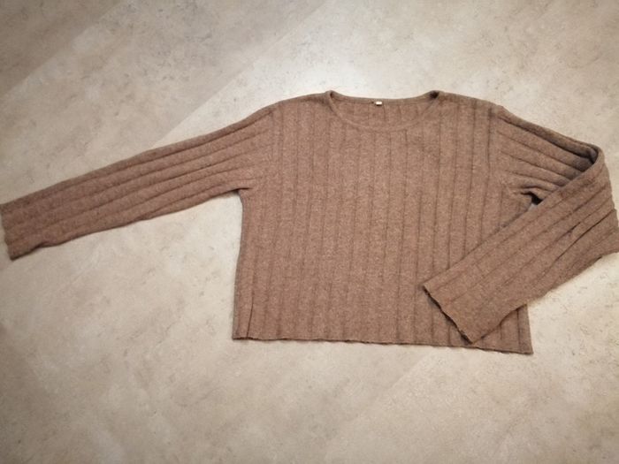 Il est indiqué taille 44/46.Largeur 50 cm,longueur 47 cm.70% laine,30% polyamide.Très agréable
