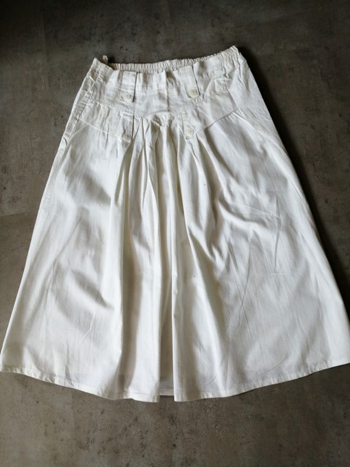 100% coton.La taille n'est plus indiquée.Largeur taille. Longueur 75 cm.Taille élastiquée derrière.Passants ceinture.Beau coton.