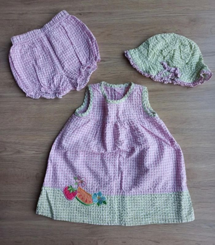 Ensemble tenue bébé 12mois 1 an une robe un short un chapeau Vichy violet vert - photo numéro 1